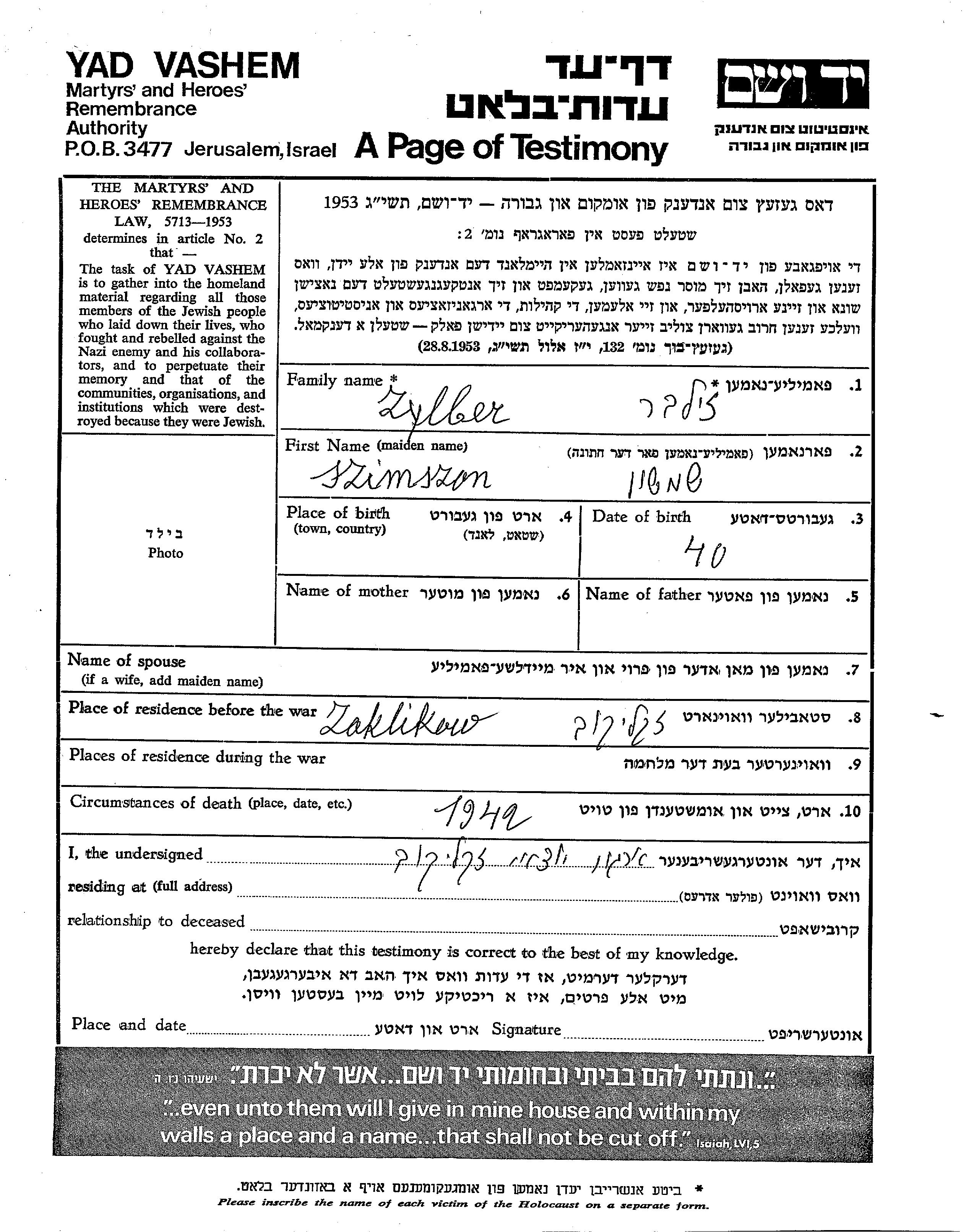 Zylber Szimszon Zaklikow, Poland Page of Testimony