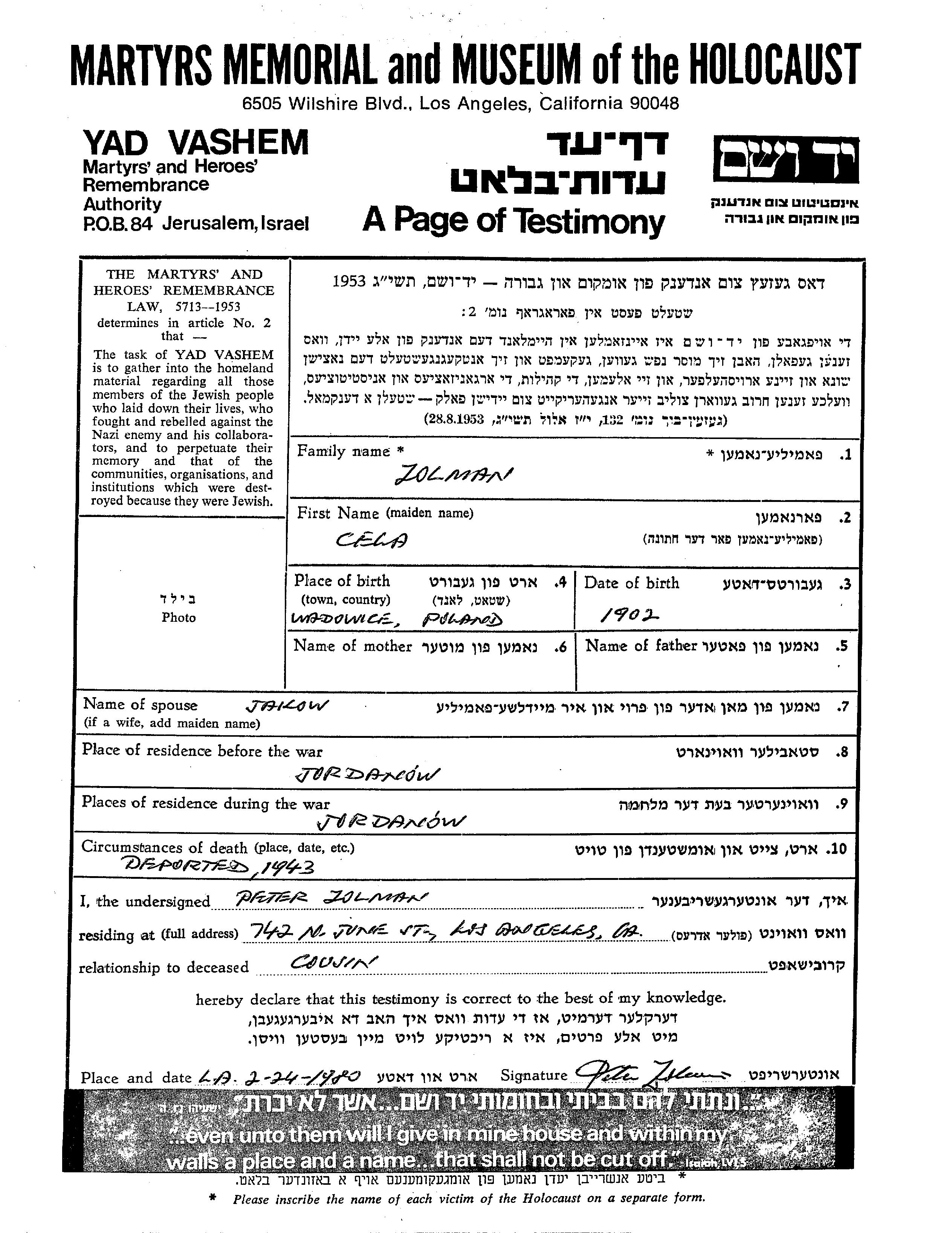 Zolman Cela 1902 Jordanow, Poland Page of Testimony