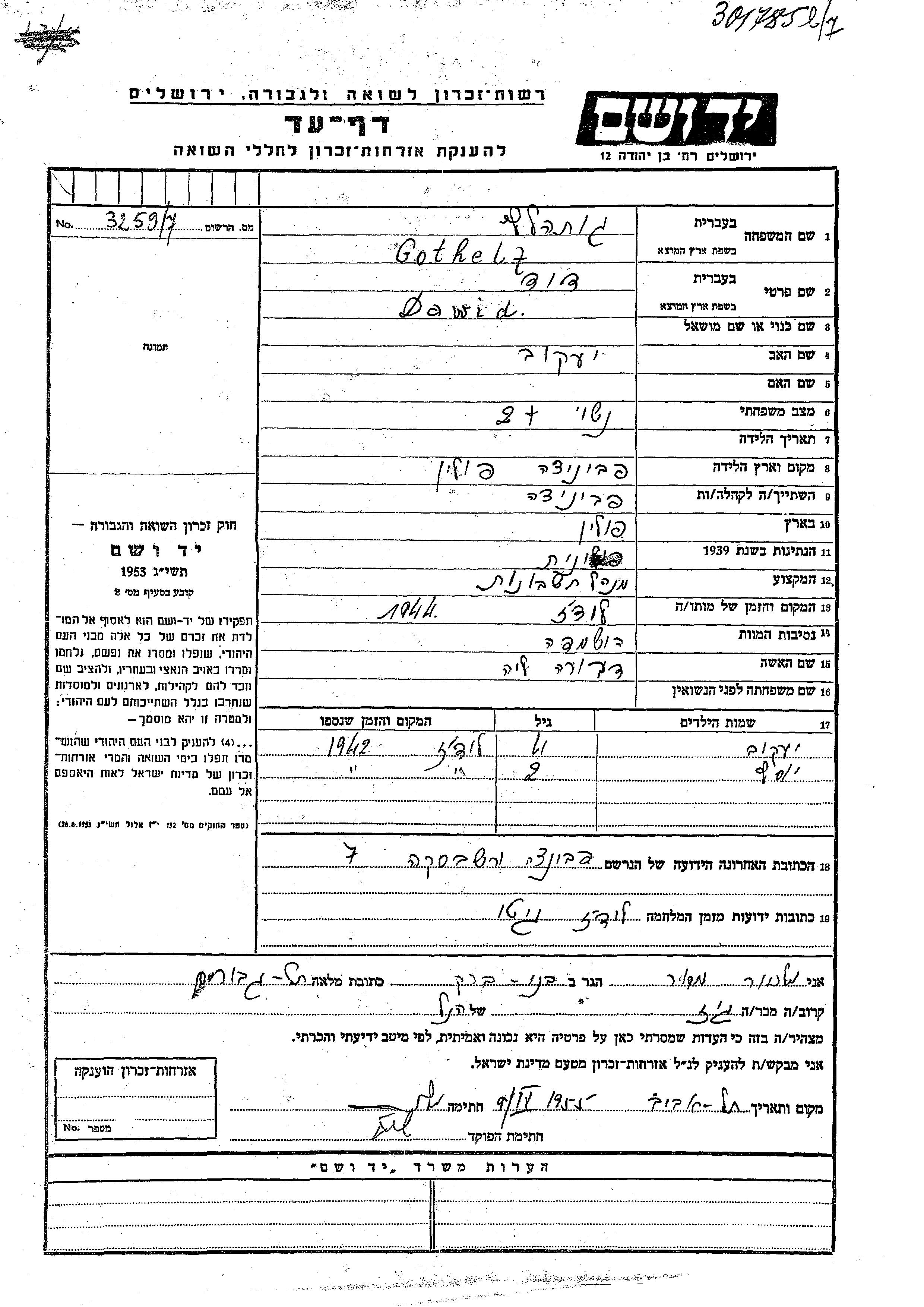 Yosef Gothelf was born to Dawid and Dvora nee Lea. He was child. Prior to WWII he lived in Pabianice, Poland. During the war he was in Lodz, Poland.