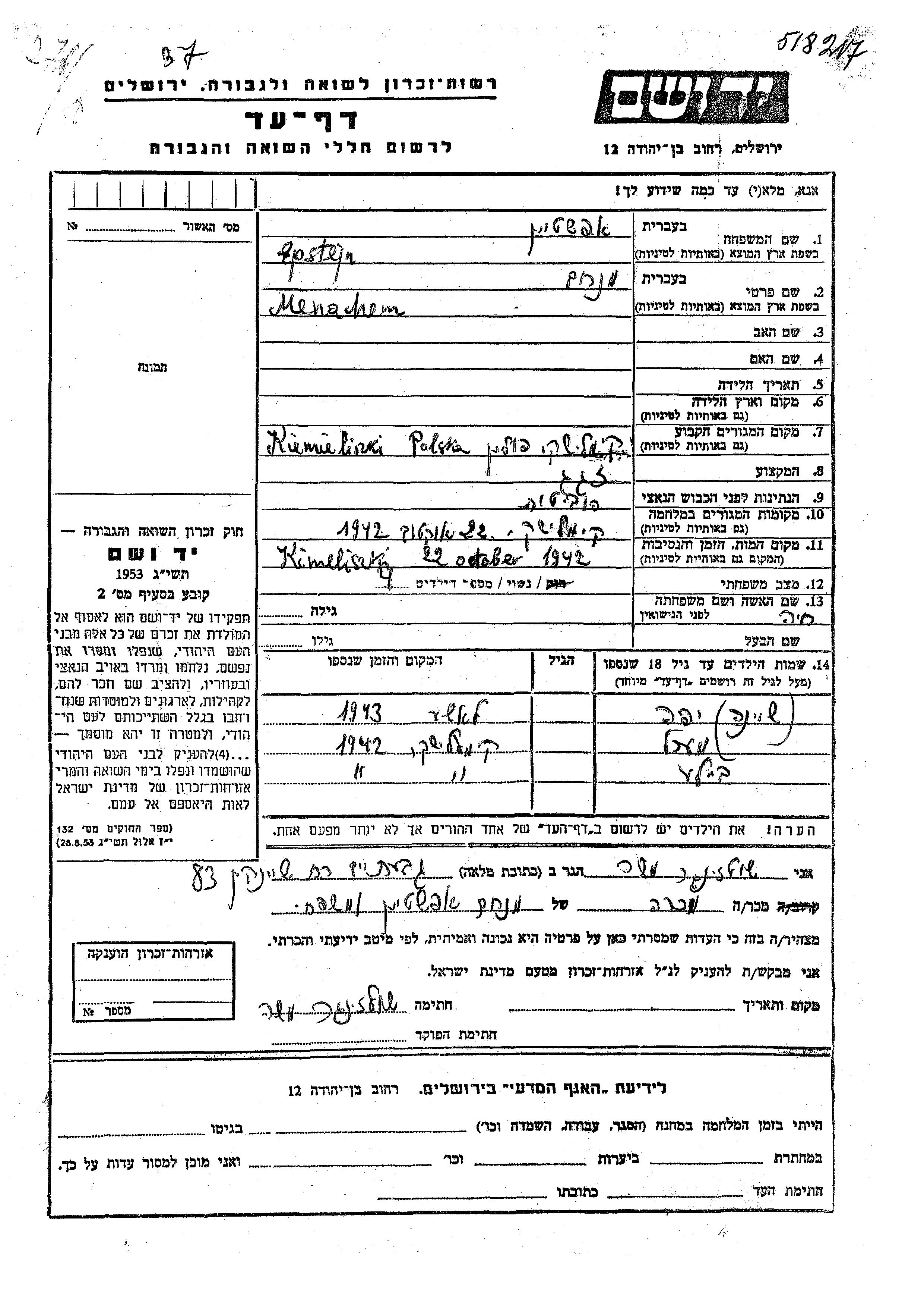 Yad Vashem - Pages of Testimony Names Memorial Collection