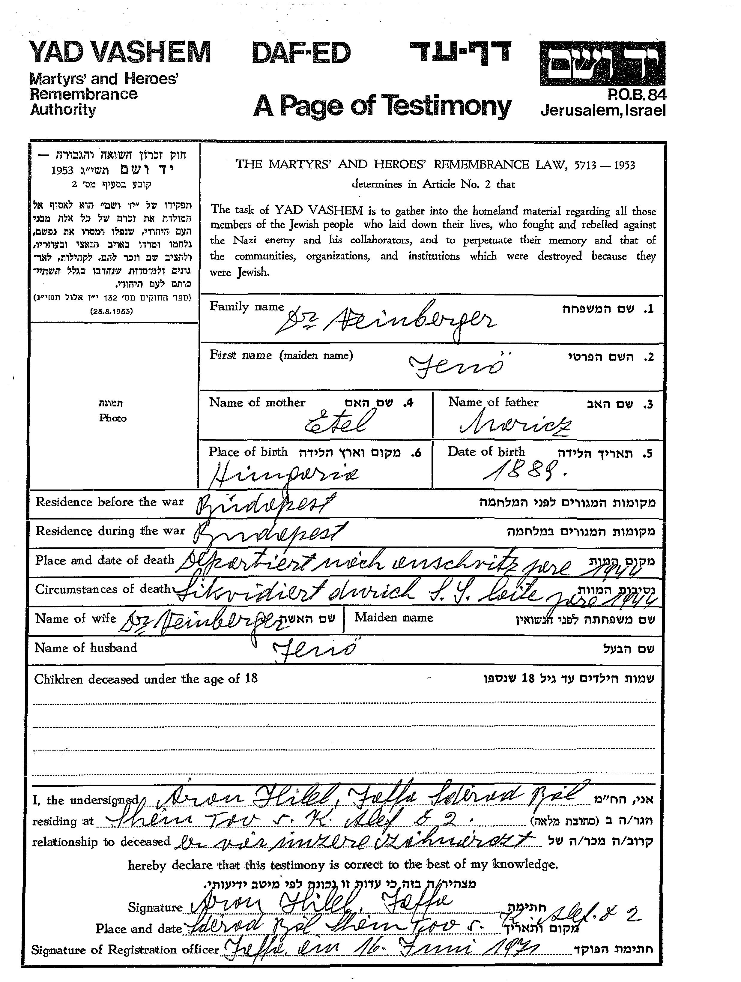 Veinberg Jeno 1889 Budapest, Hungary Page of Testimony