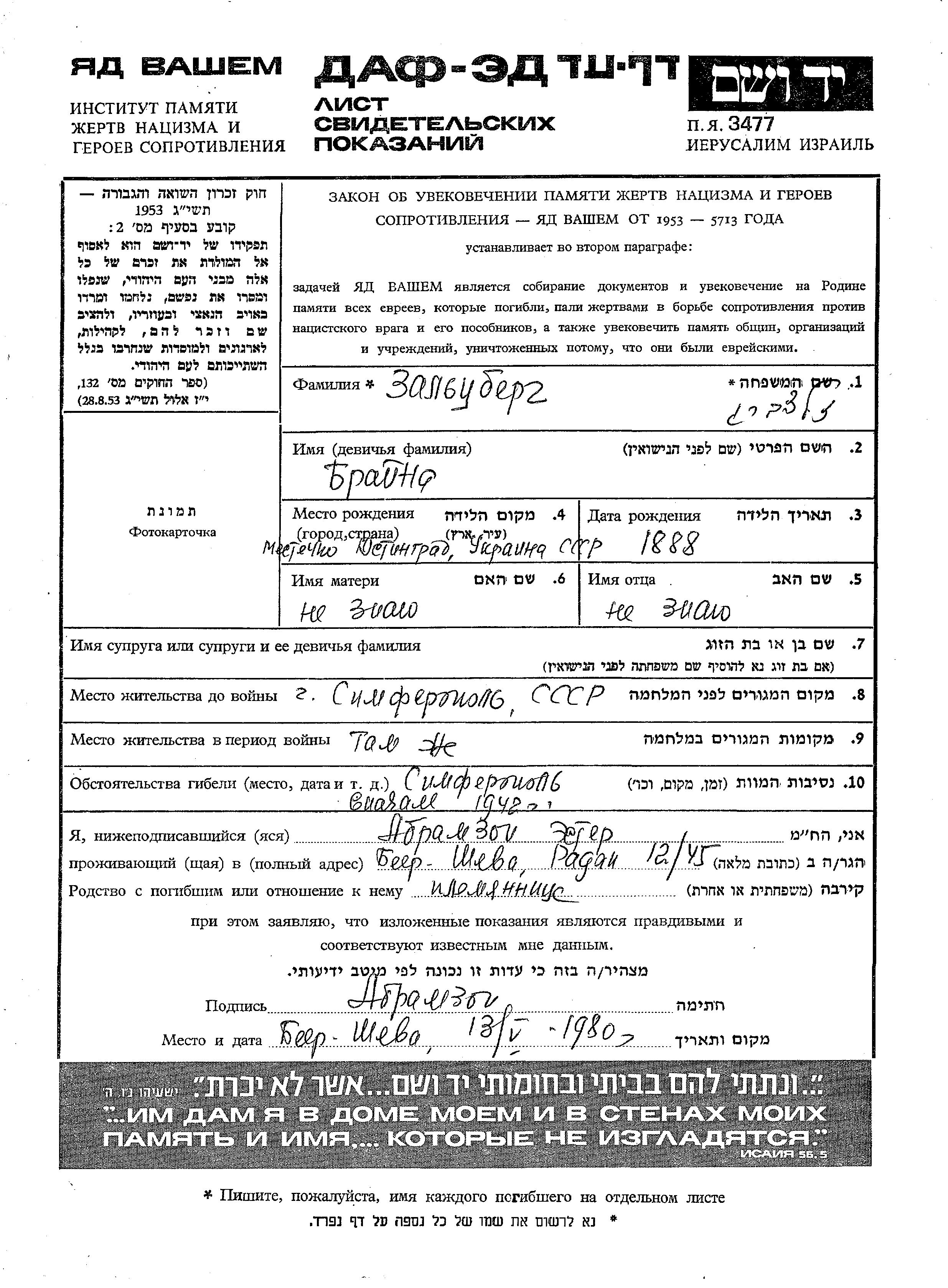 Braina Zaltzberg was born in Yustingrad, Ukraine (USSR), 1888. Prior to WWII she lived in Simferopol, Russia (USSR). During the war she was in Simferopol, Russia (USSR). Braina was murdered in the Shoah. Place of death: Simferopol, Russia (USSR), 1942.