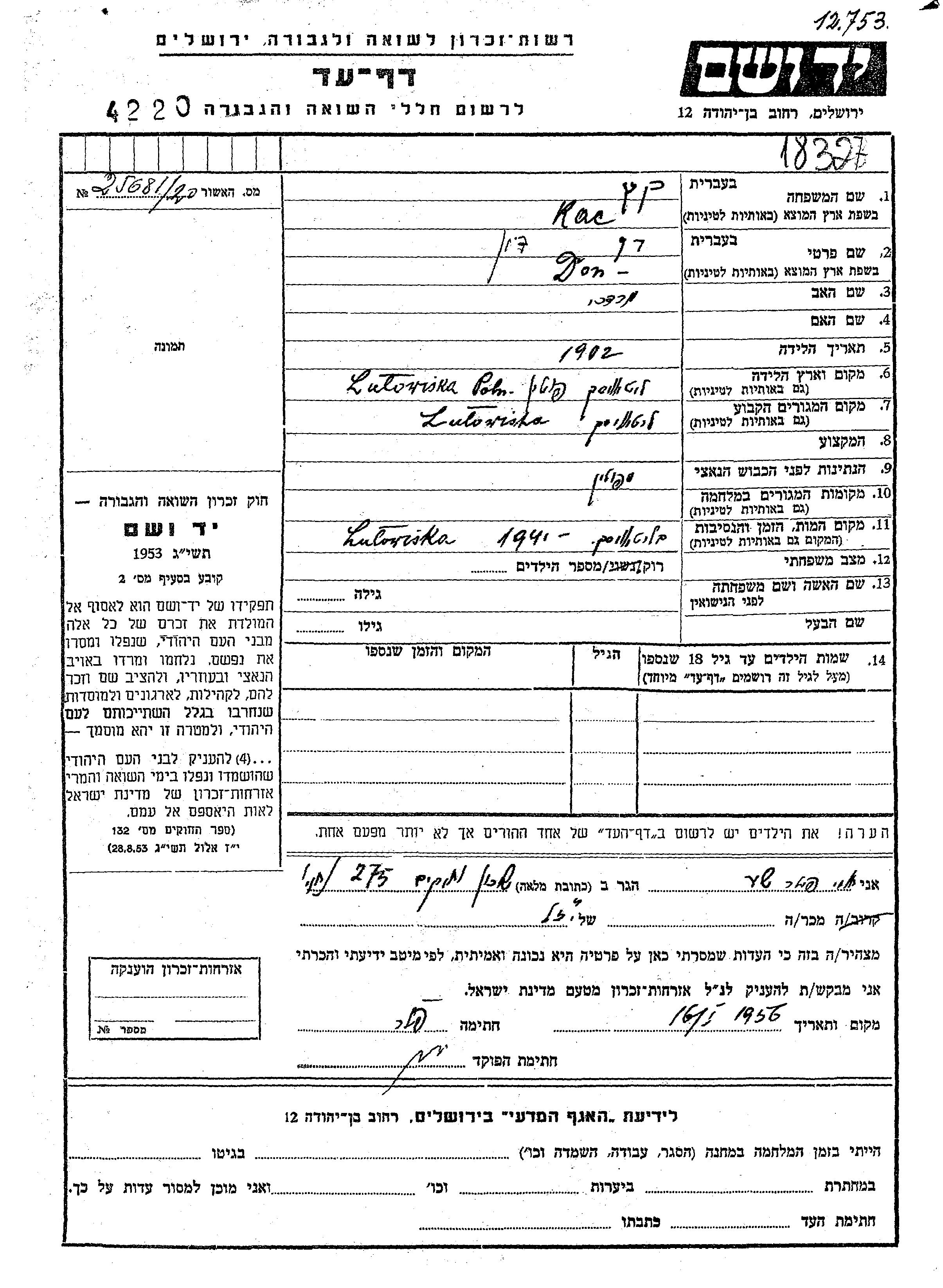 Dan Don Kac was born in Lutowiska, Poland, 1902 to Mordekhai. He was single. Prior to WWII he lived in Lutowiska, Poland. Dan Don was murdered in the Shoah. Place of death: Lutowiska, Poland, 1941.