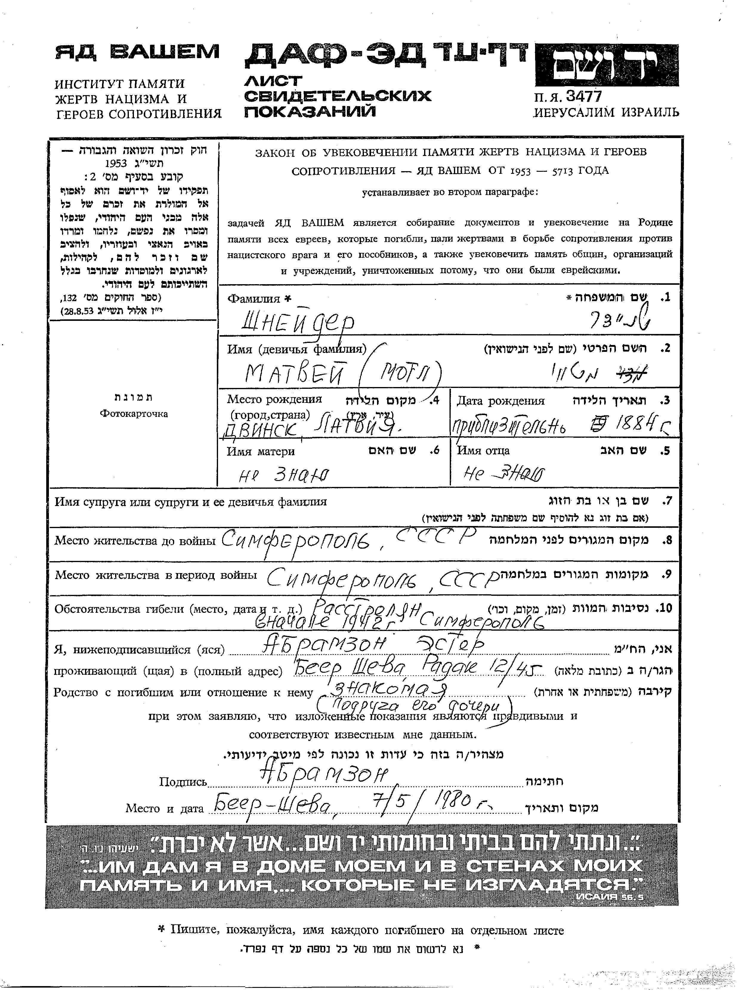 Matvei Motl Shneider was born in Dvinsk, Latvia, 1884. Prior to WWII he lived in Simferopol, Russia (USSR). During the war he was in Simferopol, Russia (USSR). Matvei Motl was murdered in the Shoah. Place of death: Simferopol, Russia (USSR), 1942.