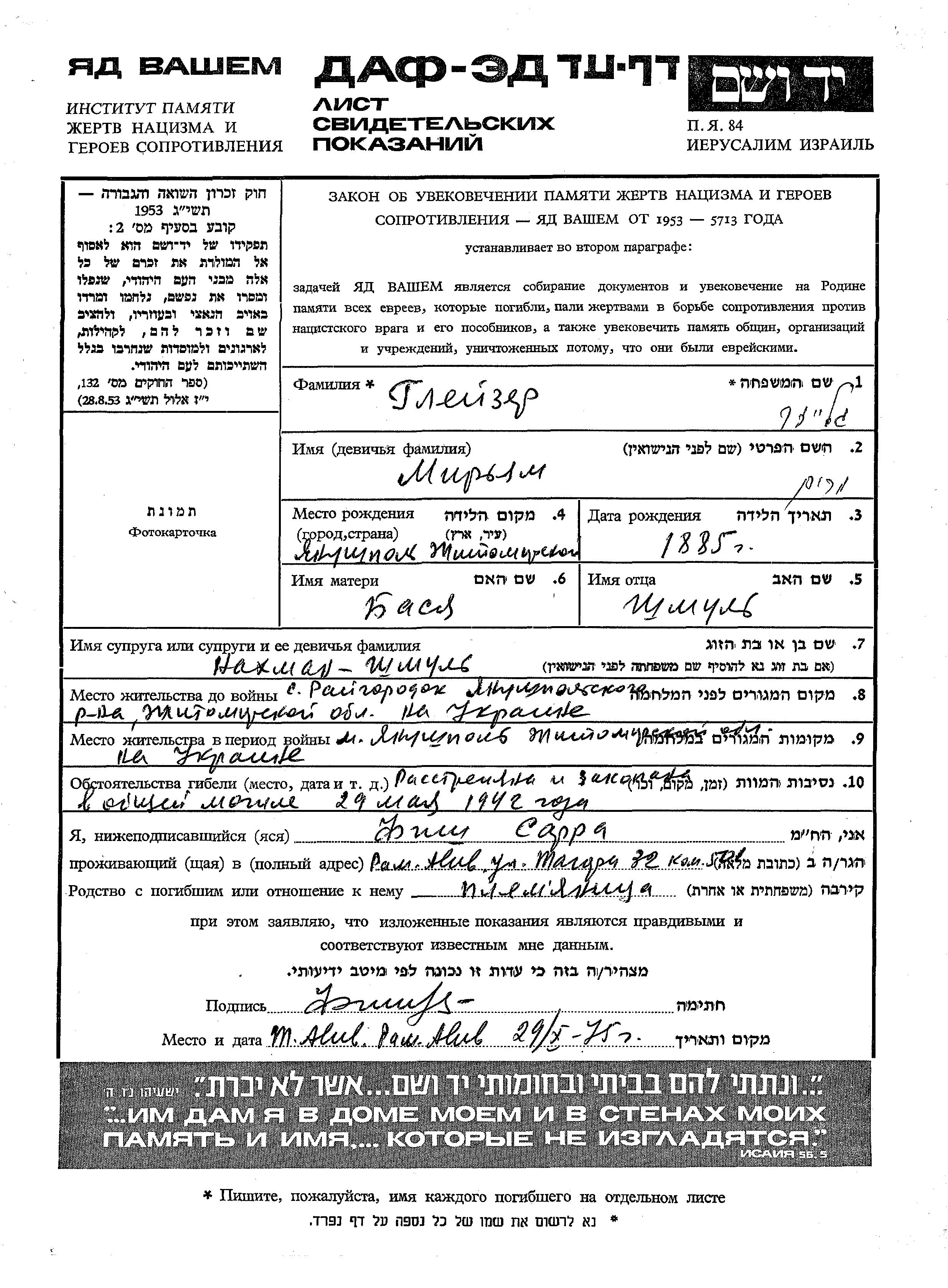 Mirjam Gleizer was born in Yanushpol, Ukraine (USSR), 1885 to Shmul and Basya. She was married to Shmul Nakhman. Prior to WWII she lived in Raigorodok, Ukraine (USSR). During the war she was in Yanushpol, Ukraine (USSR). Mirjam was murdered in the Shoah. Place of death: unknown, 29/05/1942.
