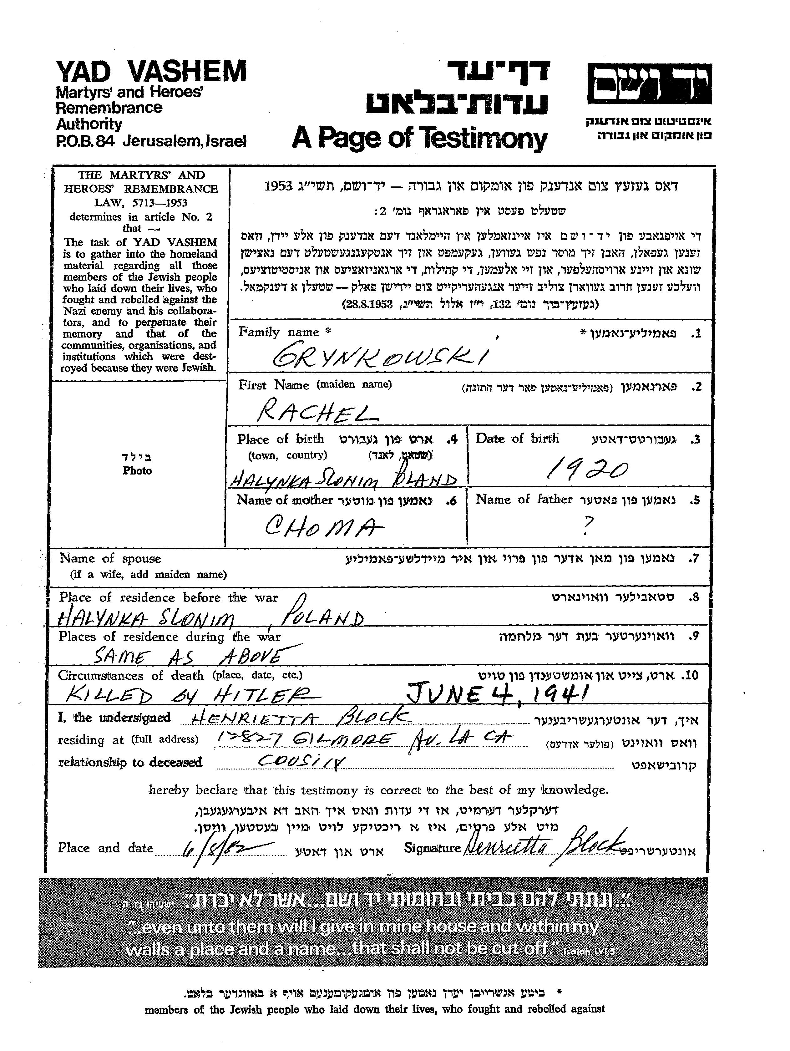 Rachel Grynkowski was born in Halynka, Poland, 1920 to Choma. Prior to WWII she lived in Halynka, Poland. During the war she was in Halynka, Poland. Rachel was murdered in the Shoah. Place of death: unknown, 04/06/1941.