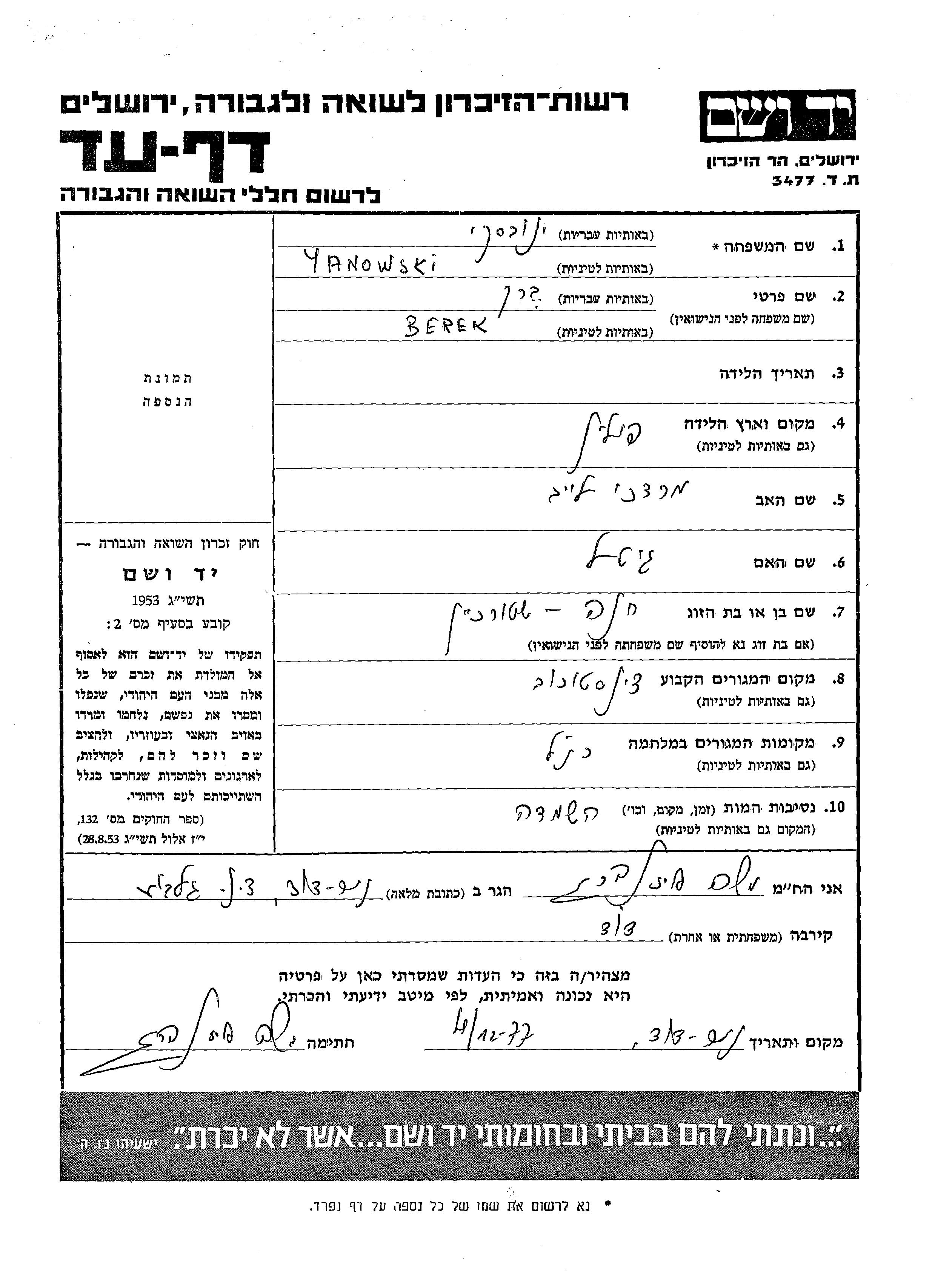 Berek Yanowski was born in Poland to Mordekhai Leib and Gitel. He was married to Khana nee Shtorkhein. Prior to WWII he lived in Chenstochov, Poland. During the war he was in Chenstochov, Poland. Berek was murdered in the Shoah.