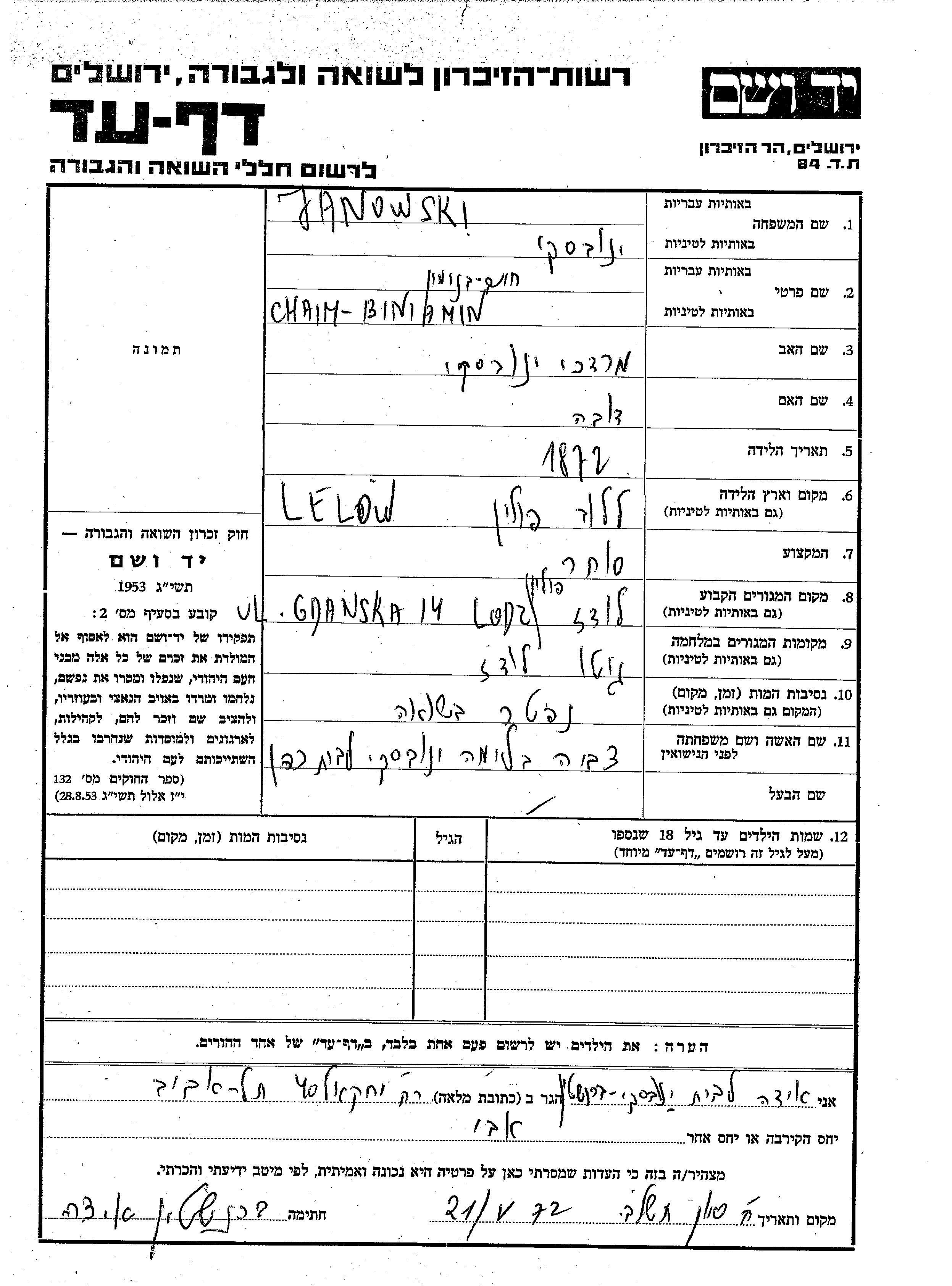 Chaim Biniamin Janowski was born in Lelow, Poland, 1872 to Mordekhai and Doba. He was a merchant and married to Tzvia Blima nee Kohen. Prior to WWII he lived in Lodz, Poland. During the war he was in Lodz, Poland. Chaim Biniamin was murdered in the Shoah.