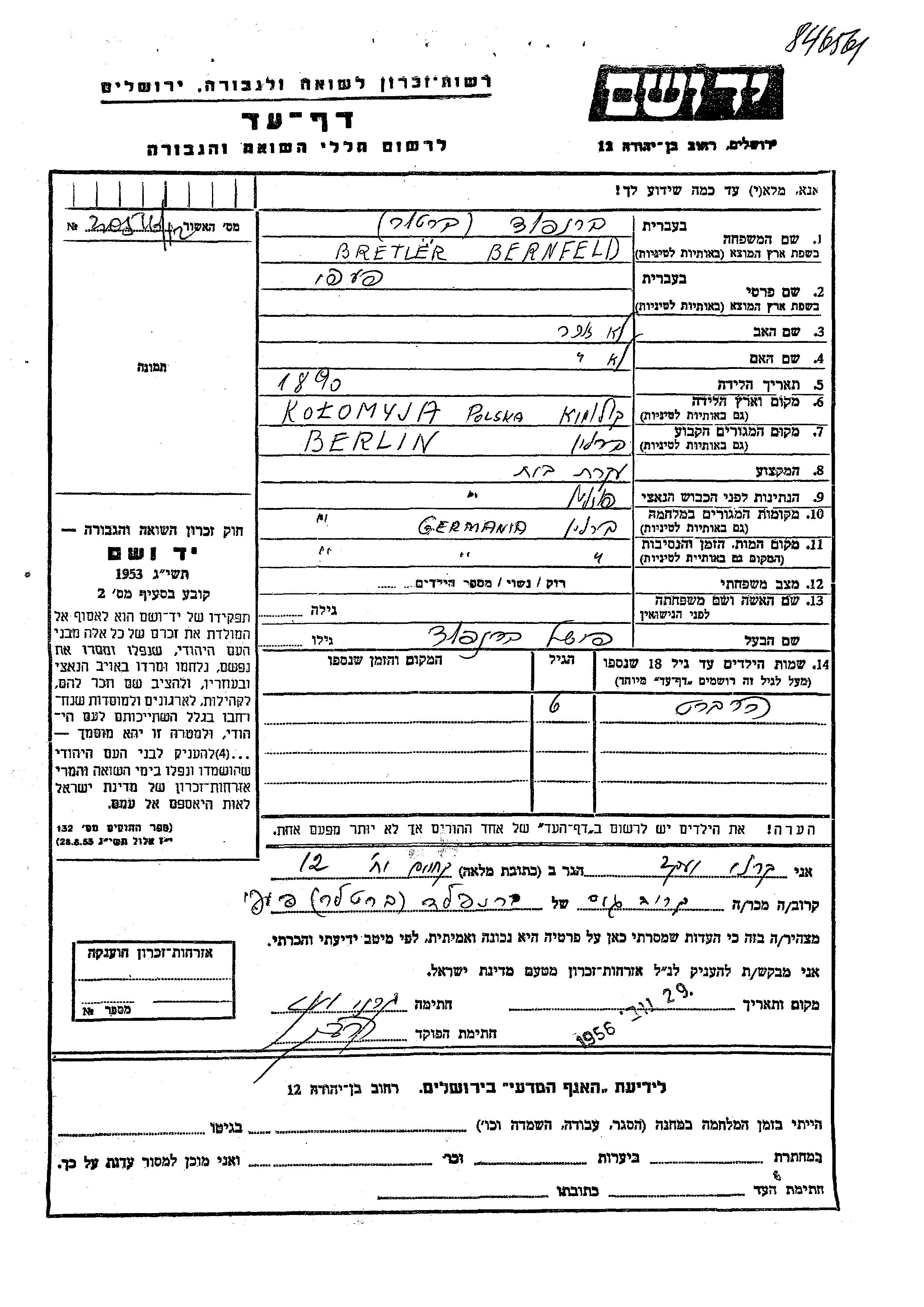 Herbert Berenfeld Bernfeld was born to Fishel and Pepi nee Bretler. He was child. Prior to WWII he lived in Berlin, Germany. During the war he was in Berlin, Germany. Herbert was murdered in the Shoah.