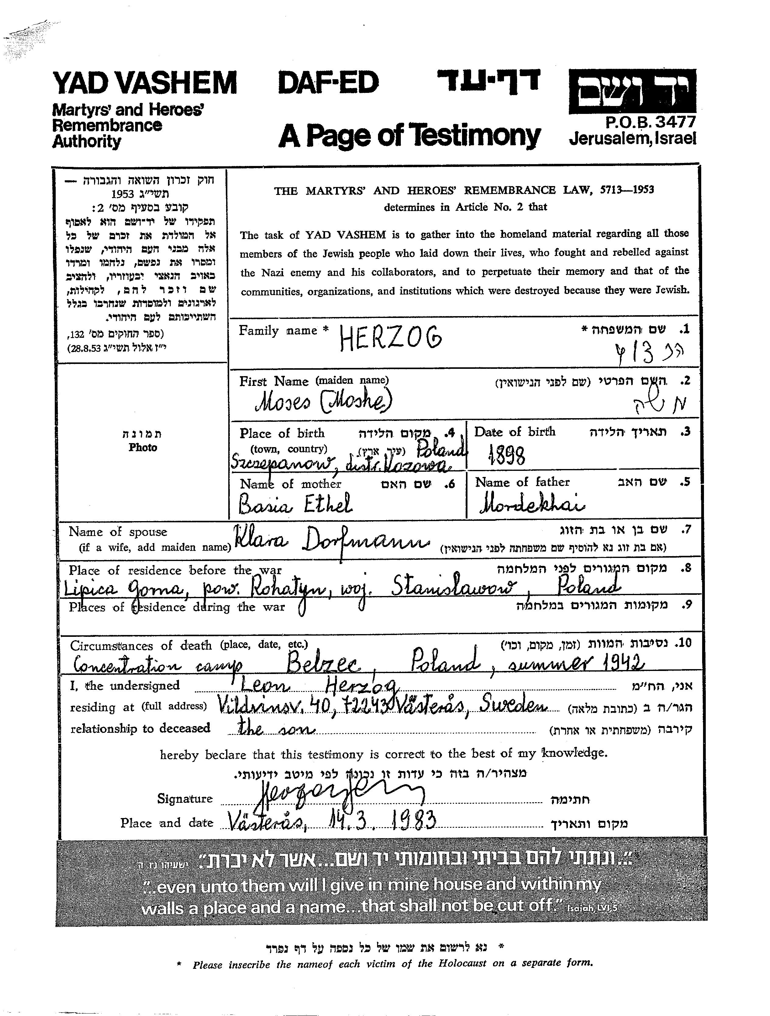 Moses Herzog was born in Szczepanow, Poland, 1898 to Mordekhai and Basia Ethel. He was married to Klara nee Dorfmann. Prior to WWII he lived in Lipica Gorna, Poland. Moses was murdered in the Shoah. Place of death: Belzec, Poland, 08/1942.