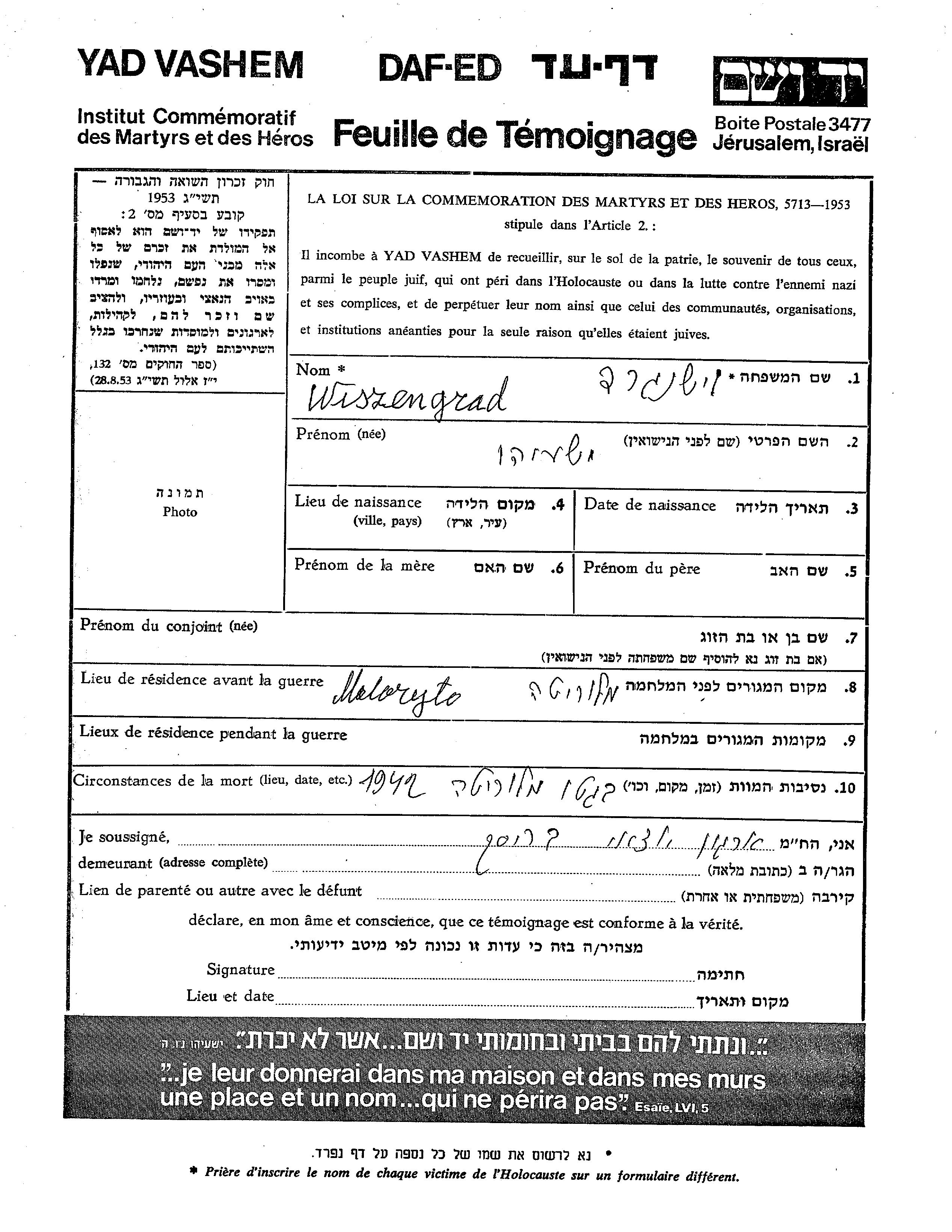 Wiszengrad Yeshayahu Maloryta, Poland Page of Testimony