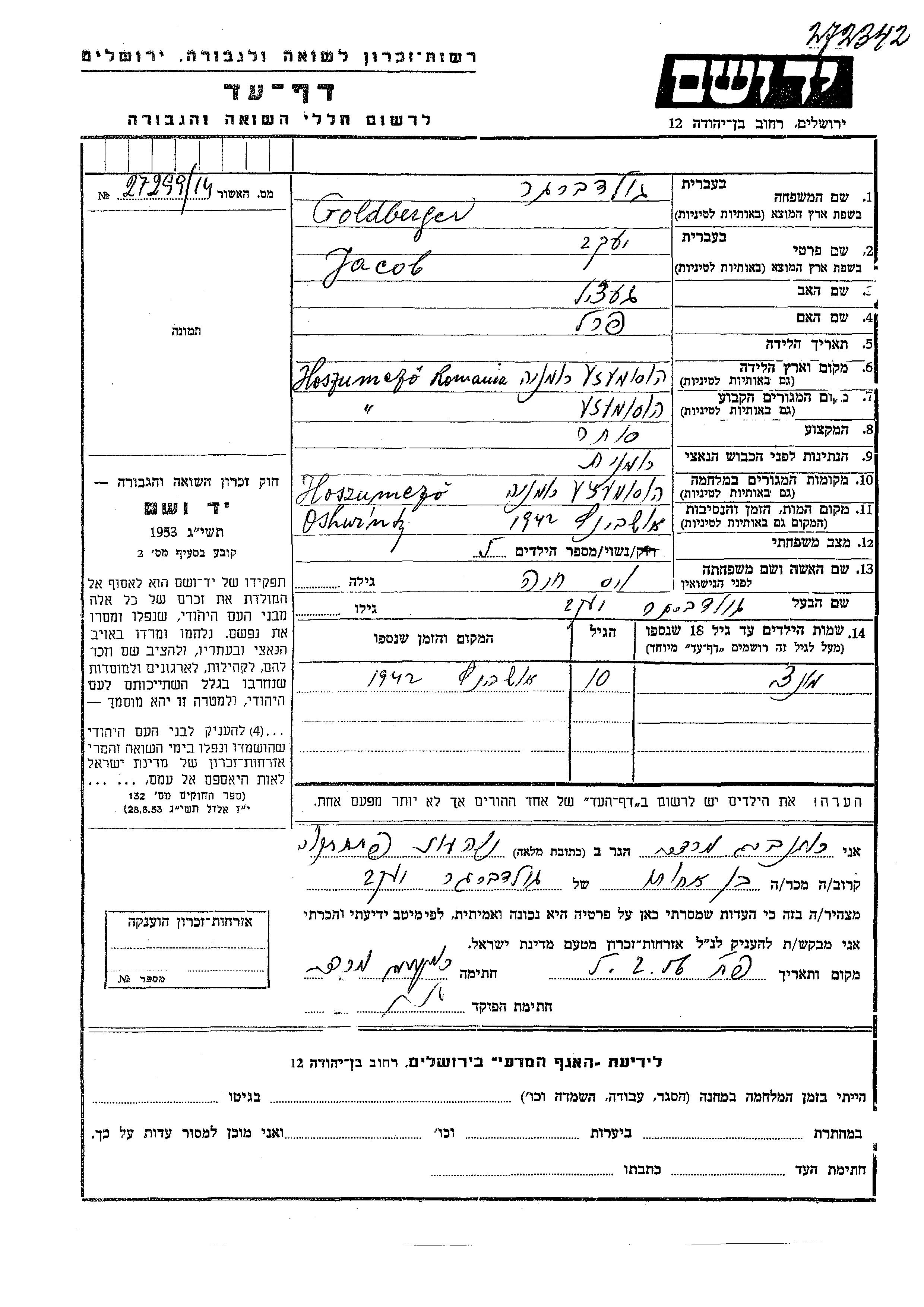 Goldberger Montzi Hoszumezo, Romania Page of Testimony