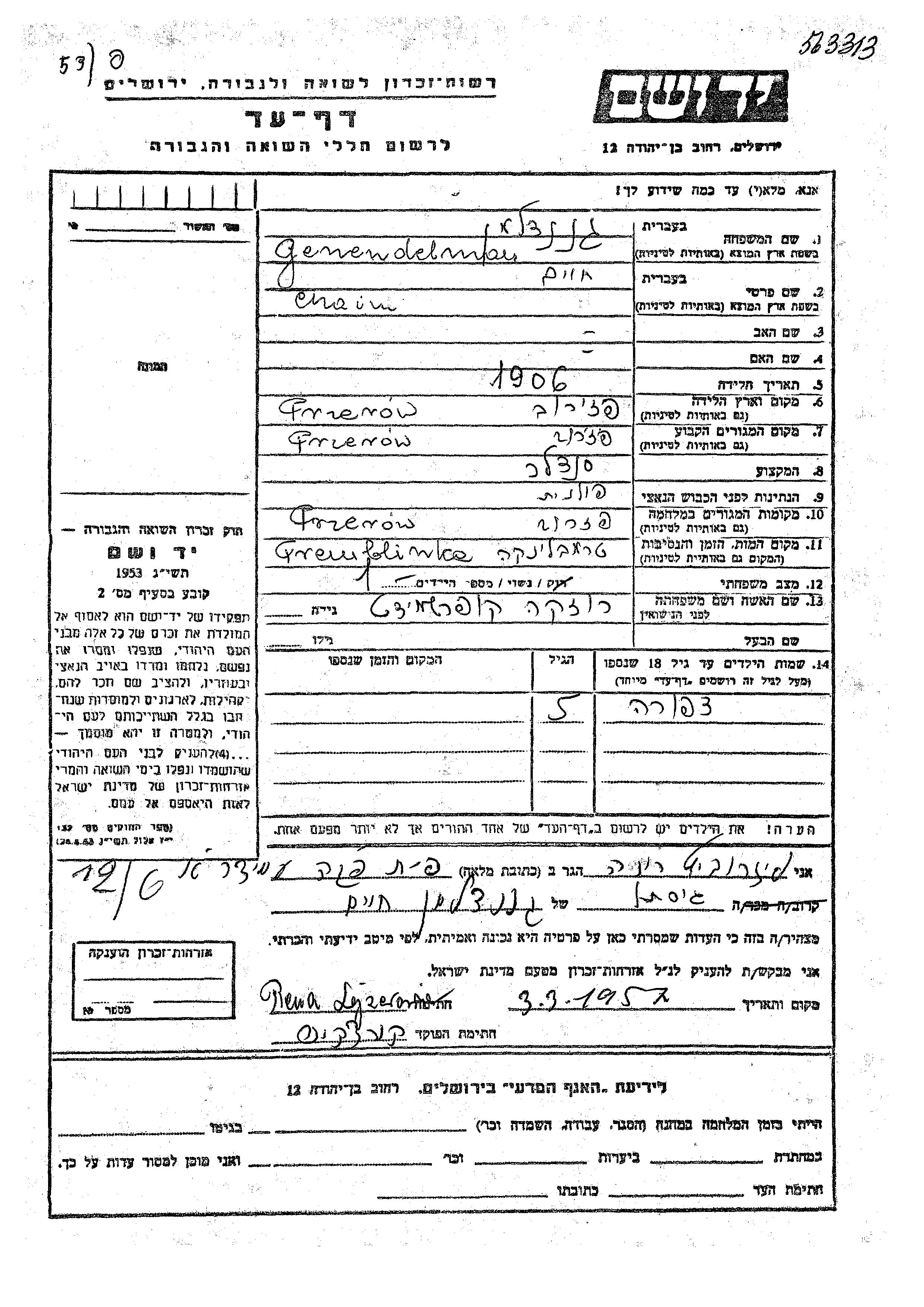Genendelman Tzipora Przerow, Poland Page of Testimony