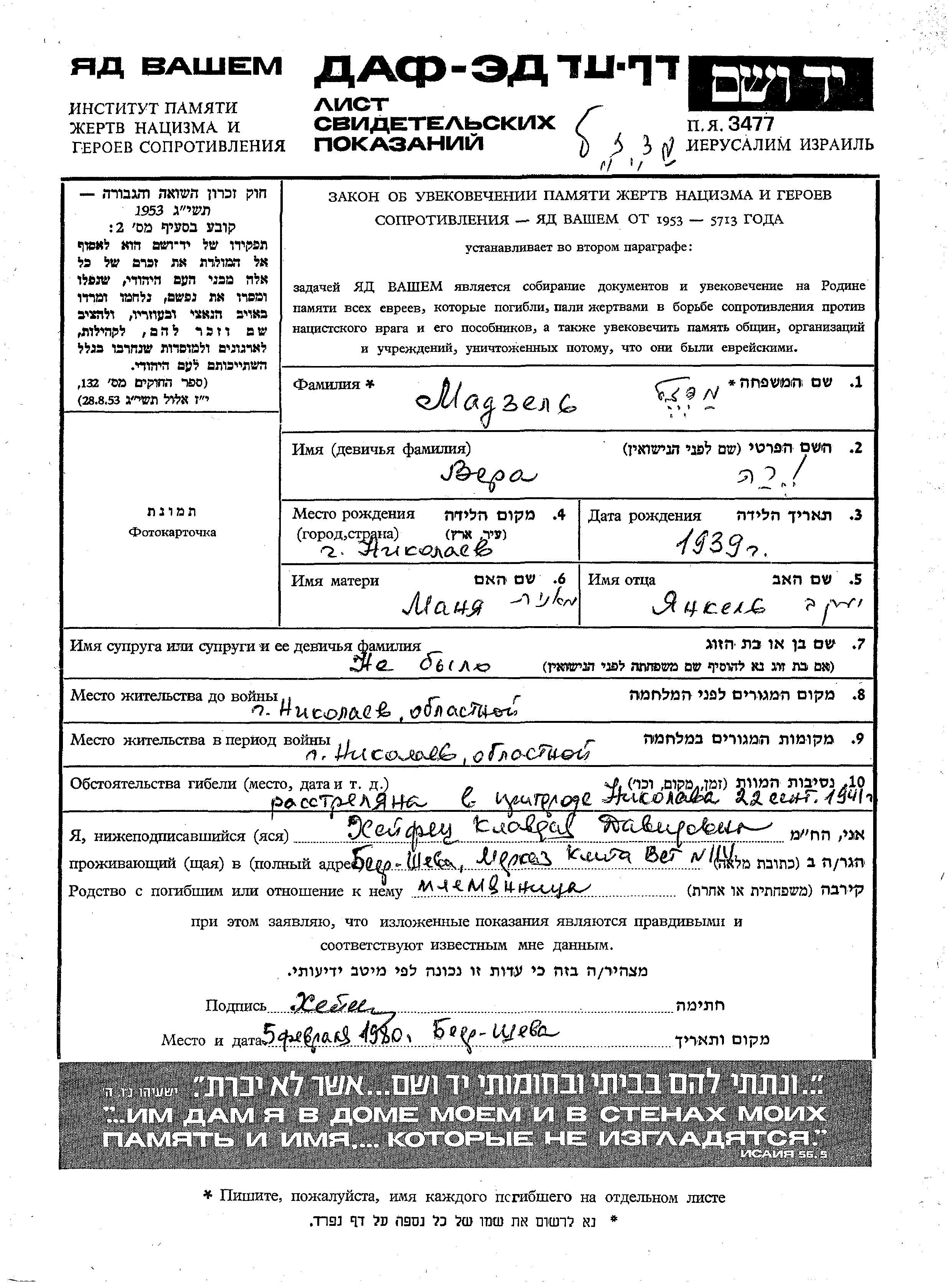 Madzel Vera 1939 Nikolayev, Page of Testimony