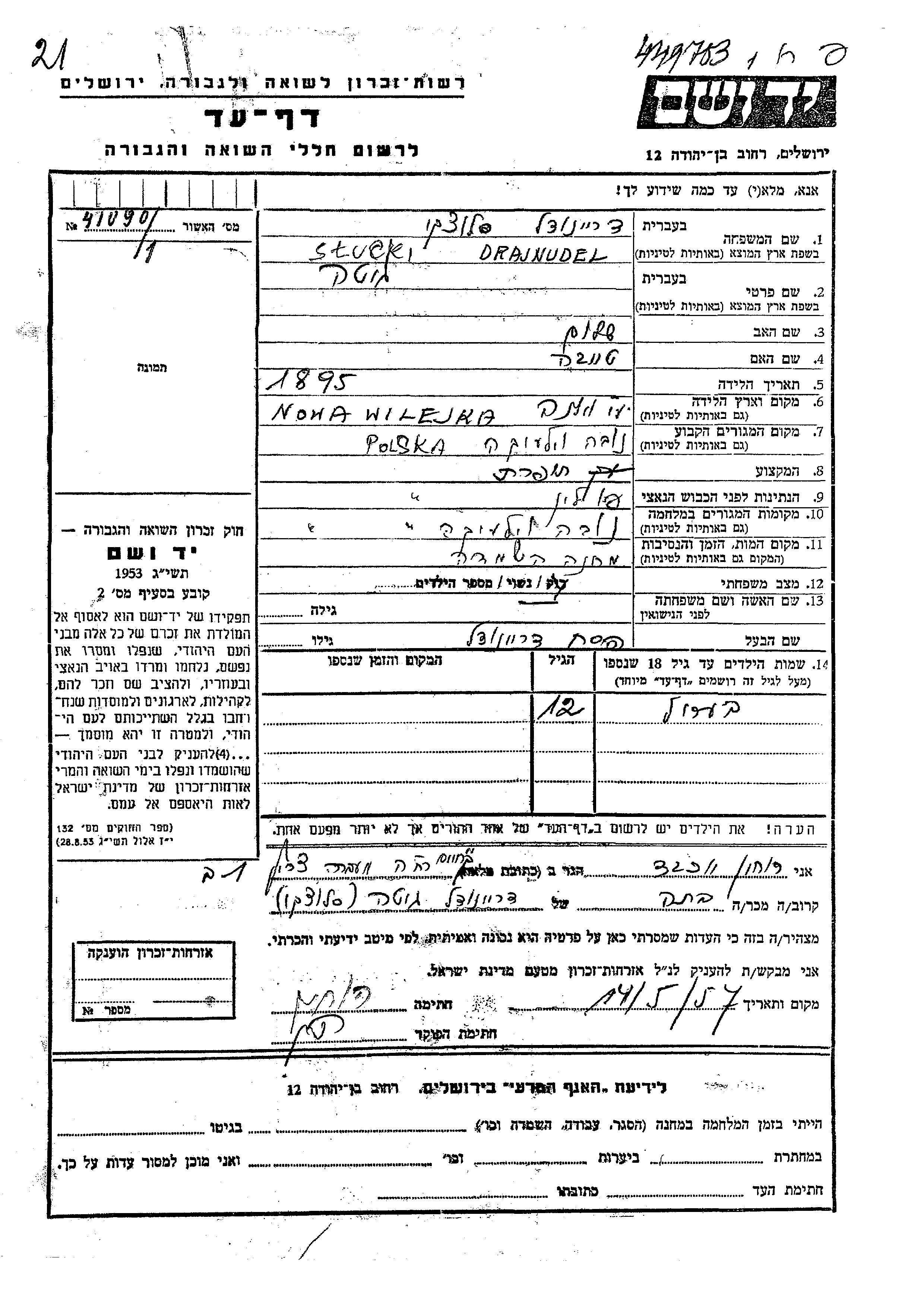 Beril Drajnudel was born to Pesakh and Gita nee Slucki. He was child. Prior to WWII he lived in Nowa Wilejka, Poland. During the war he was in Nowa Wilejka, Poland. Beril was murdered in the Shoah.