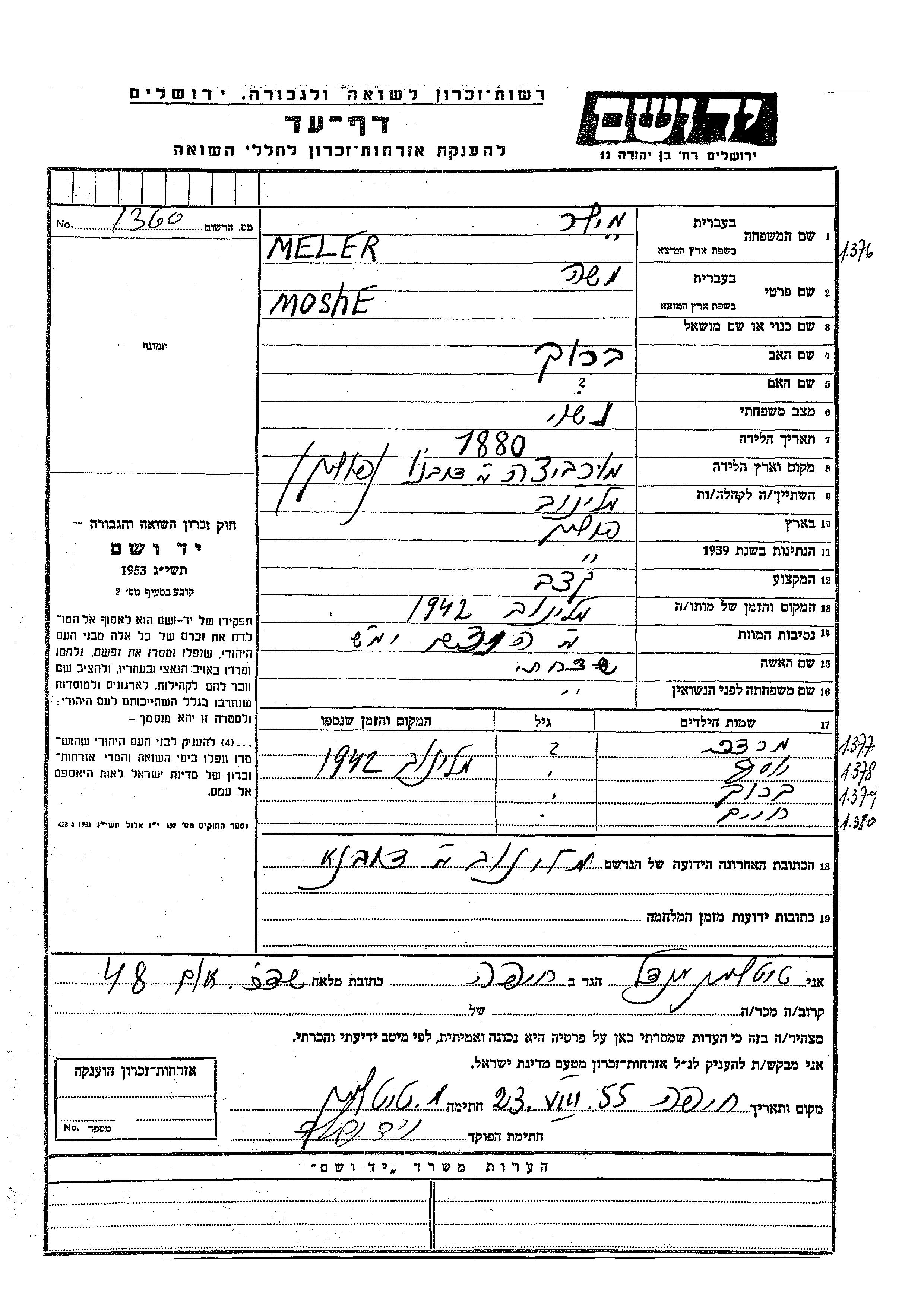 Meler Maler Miler Barukh Młynów, Poland Page of Testimony