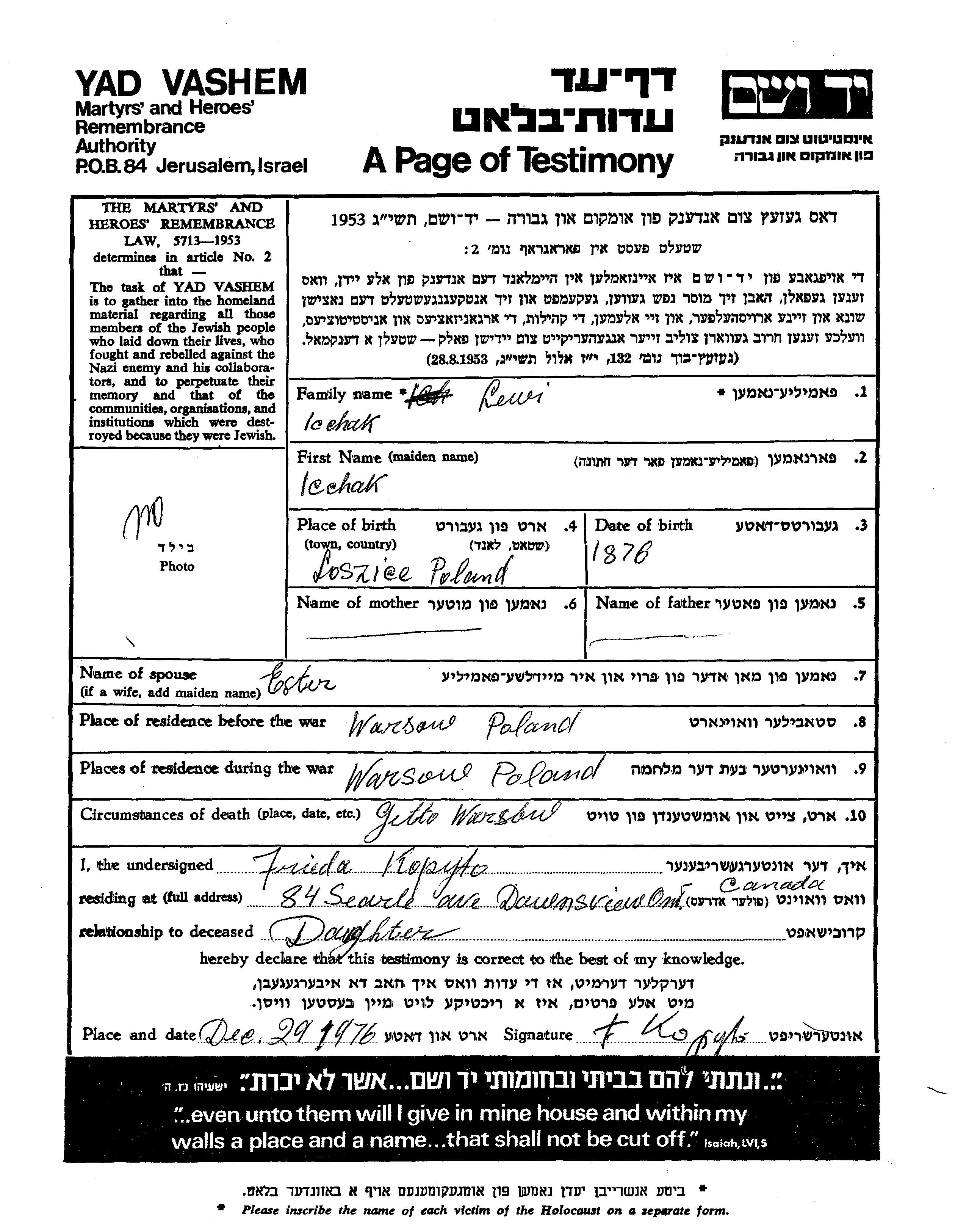 Icchak Lewi was born in Loszice, Poland, 1876. He was married to Ester. Prior to WWII he lived in Warszawa, Poland. During the war he was in Warszawa, Poland. Icchak was murdered in the Shoah. Place of death: Warszawa, Poland.