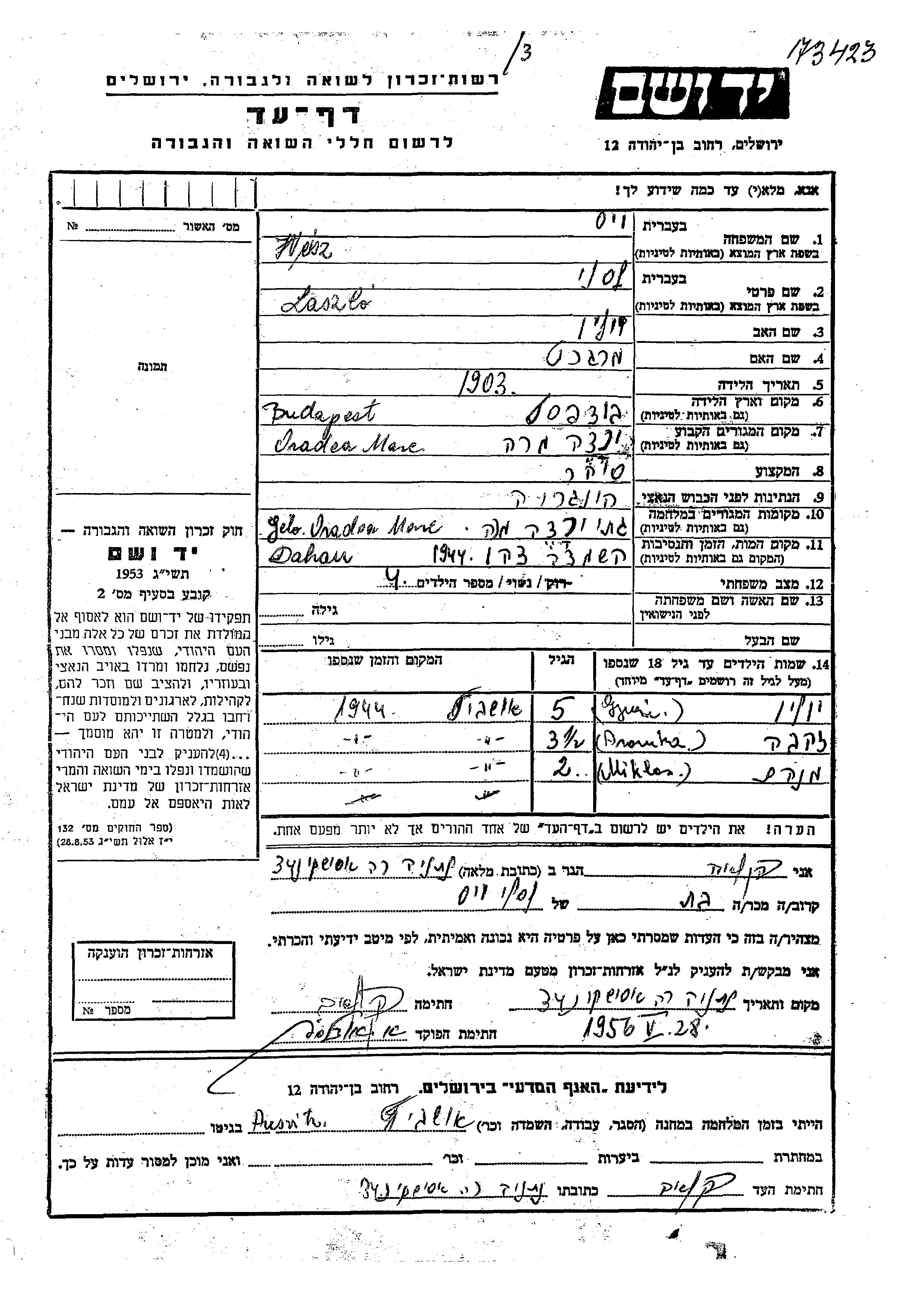 Yad Vashem - Pages of Testimony Names Memorial Collection