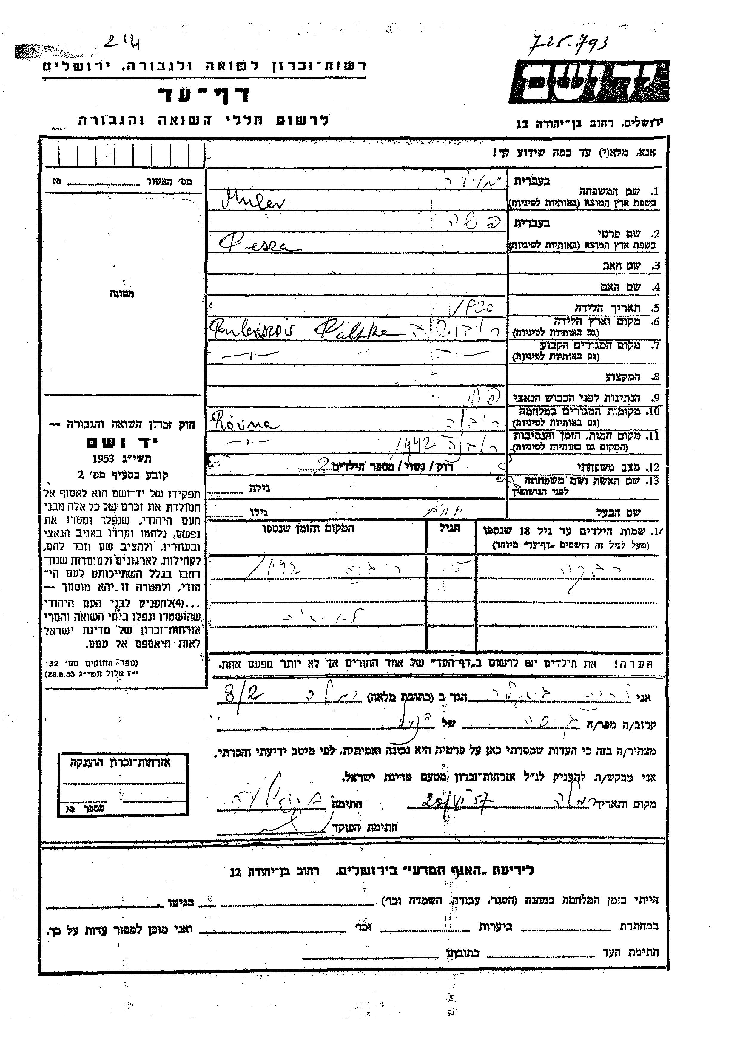 Yad Vashem - Pages of Testimony Names Memorial Collection