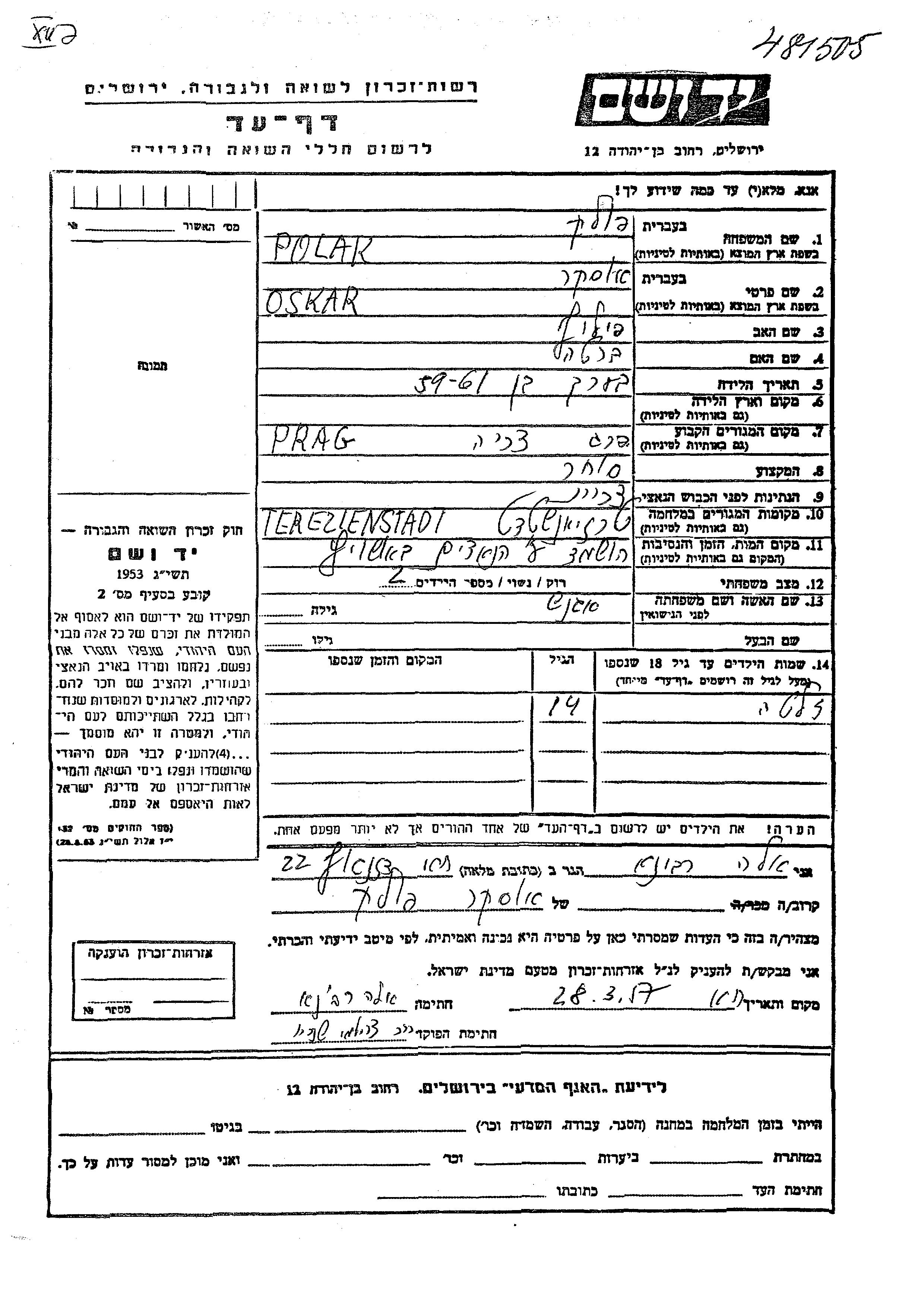 Polak Zlata Prague, Czechoslovakia Page of Testimony