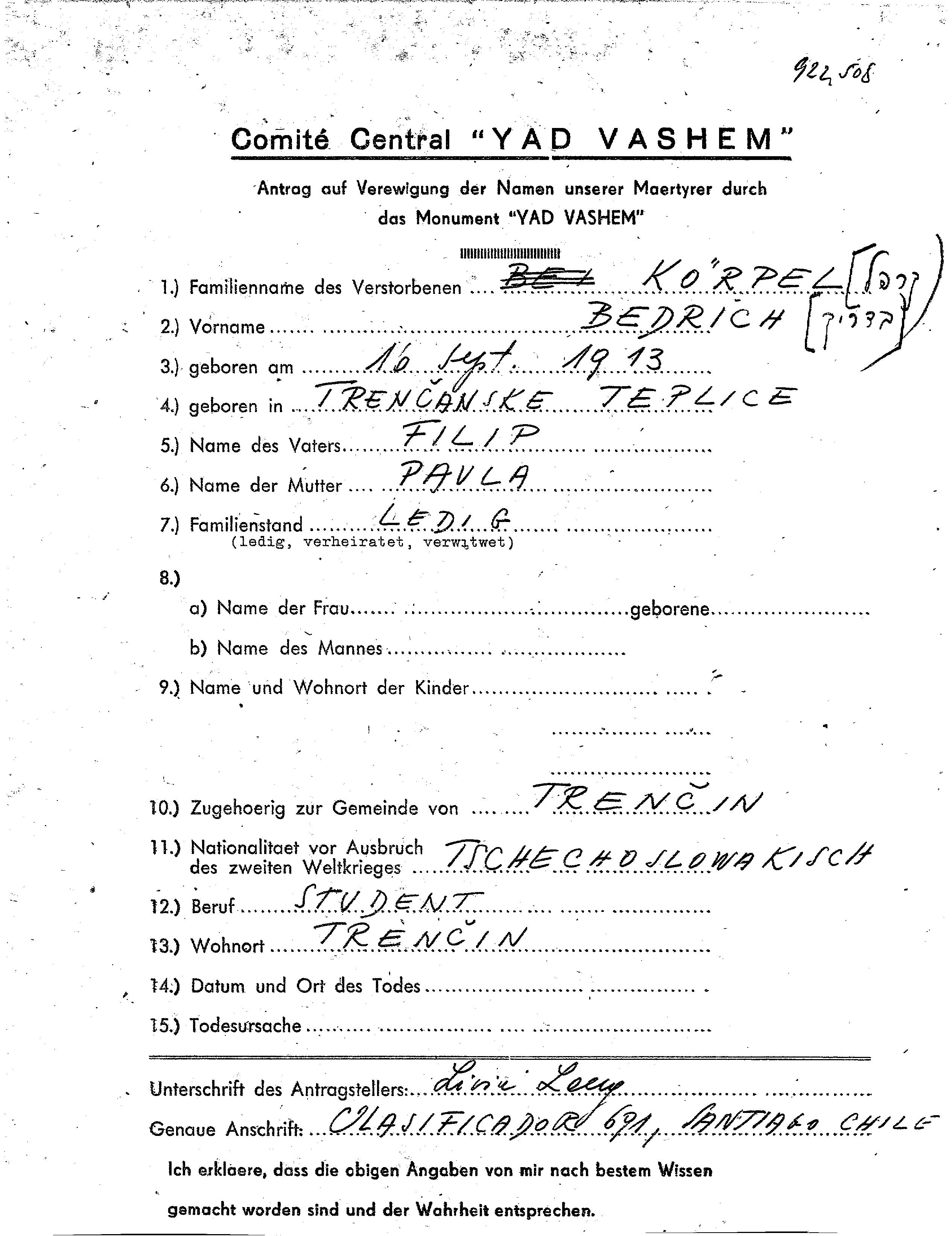Bedrich Korpel Karpel was born in Trencianske Teplice, Czechoslovakia, 1913 to Filip and Paula. He was a student and single. Prior to WWII he lived in Trencin, Czechoslovakia. During the war he was in Trencin, Czechoslovakia. Bedrich was murdered in the Shoah.