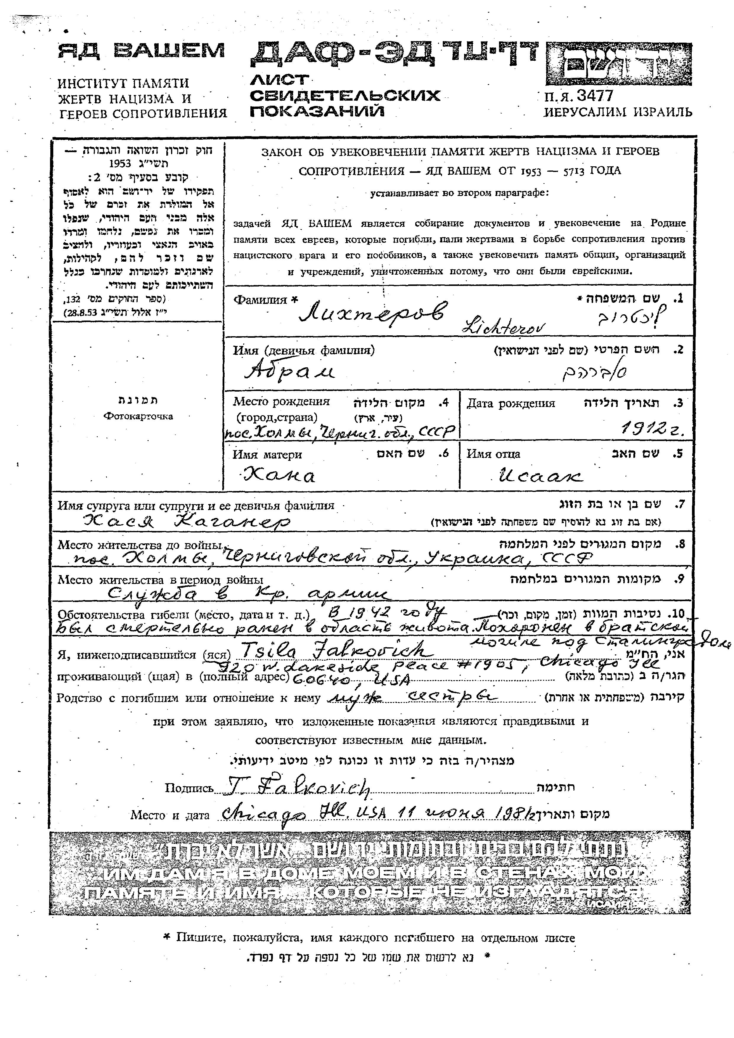 Abram Lichterov was born in Kholmy, Ukraine (USSR), 1912 to Isaak and Khana. He was married to Khasya nee Kaganer. Prior to WWII he lived in Kholmy, Ukraine (USSR). During the war he was in the Soviet armed forces. Abram was murdered in the Shoah. Place of death: Stalingrad, Russia (USSR), 1942.
