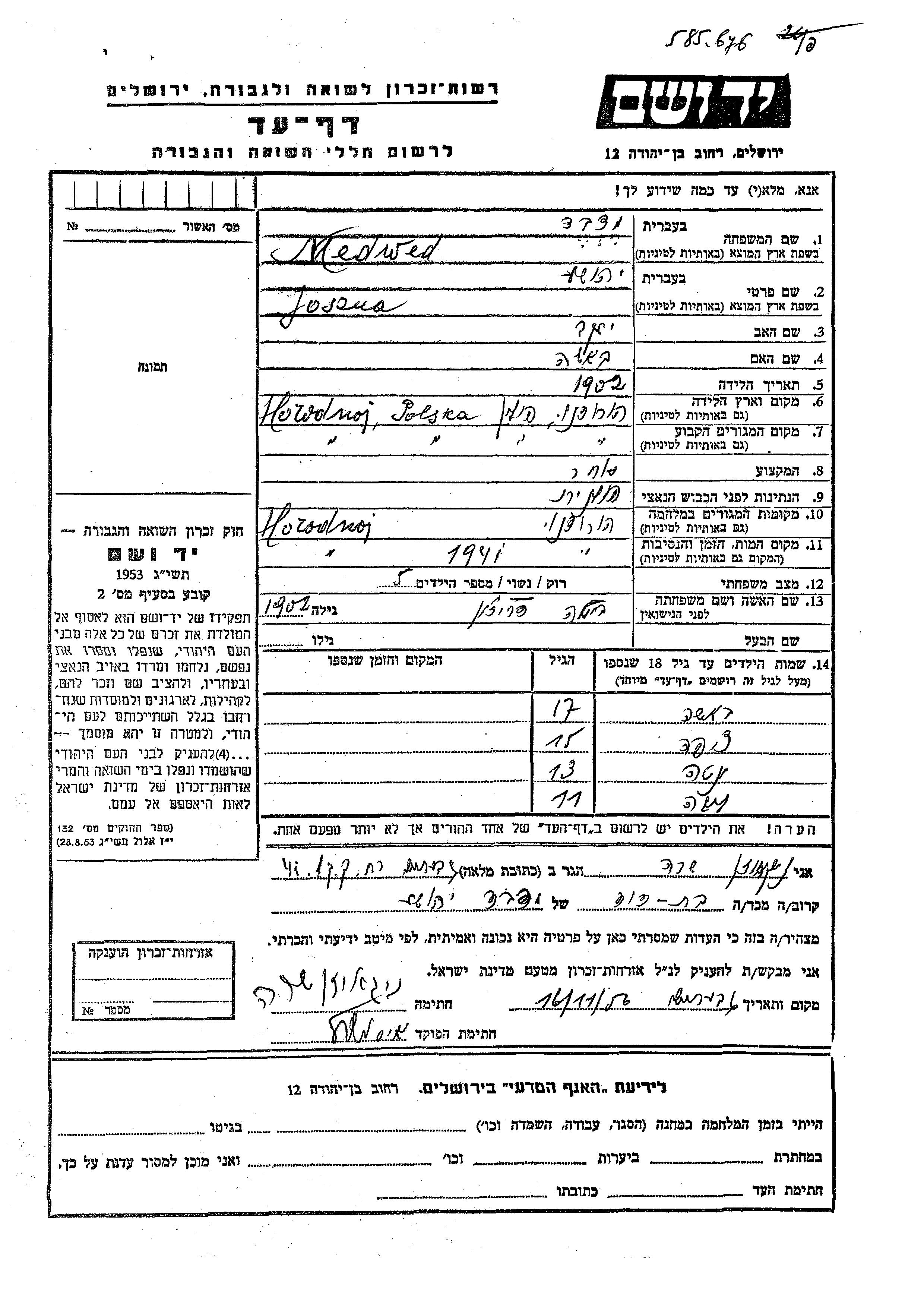 Liba Medwed was born to Joszua and Bita nee Drizun. Was child. Prior to WWII lived in Horodno, Poland. During the war was in Horodno, Poland.