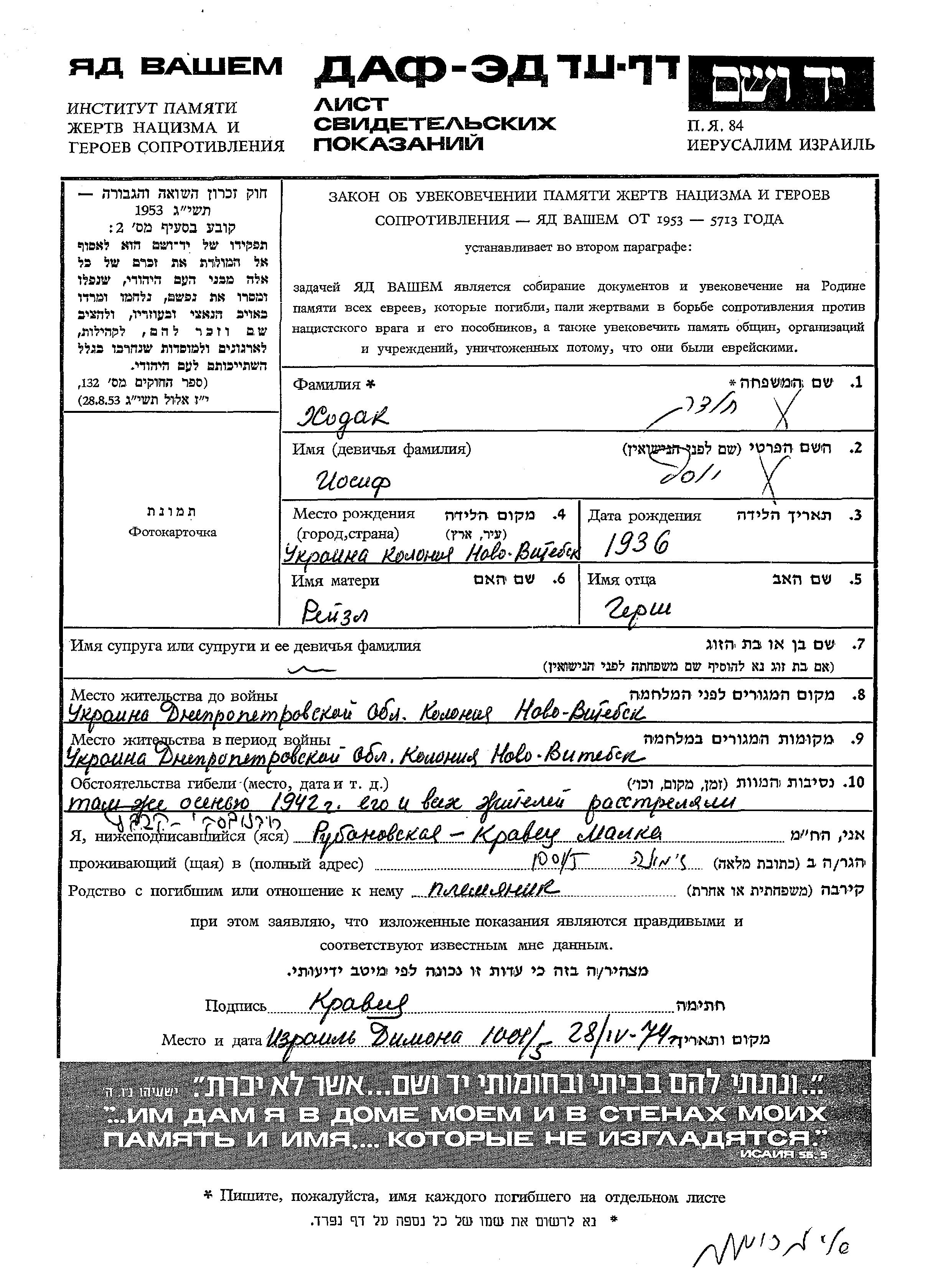 Khodak Iosif 1936 Novo Vitebsk, Ukraine (USSR) Page of Testimony
