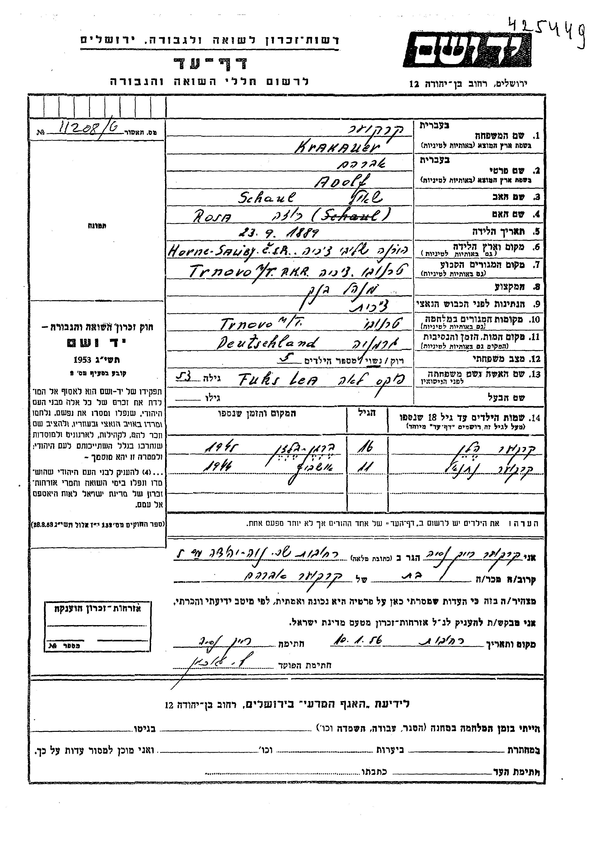Krakover Krakauer Helen Trnovo, Czechoslovakia Page of Testimony