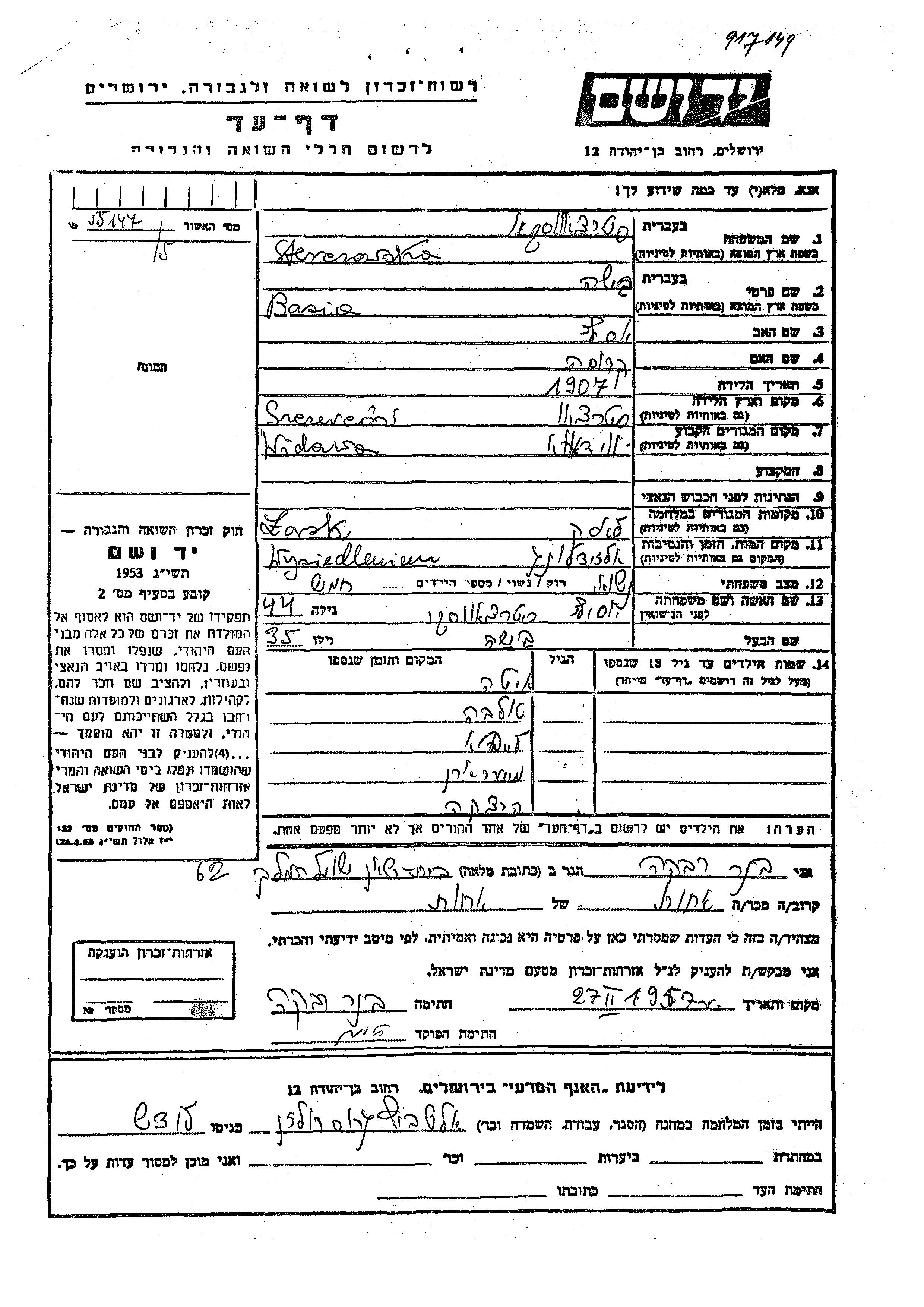 Basia Sterczowski was born in Szczercow, Poland, 1907 to Yosef and Krusa. She was married to Yosef. Prior to WWII she lived in Widawa, Poland. During the war she was in Lask, Poland. Basia was murdered in the Shoah.