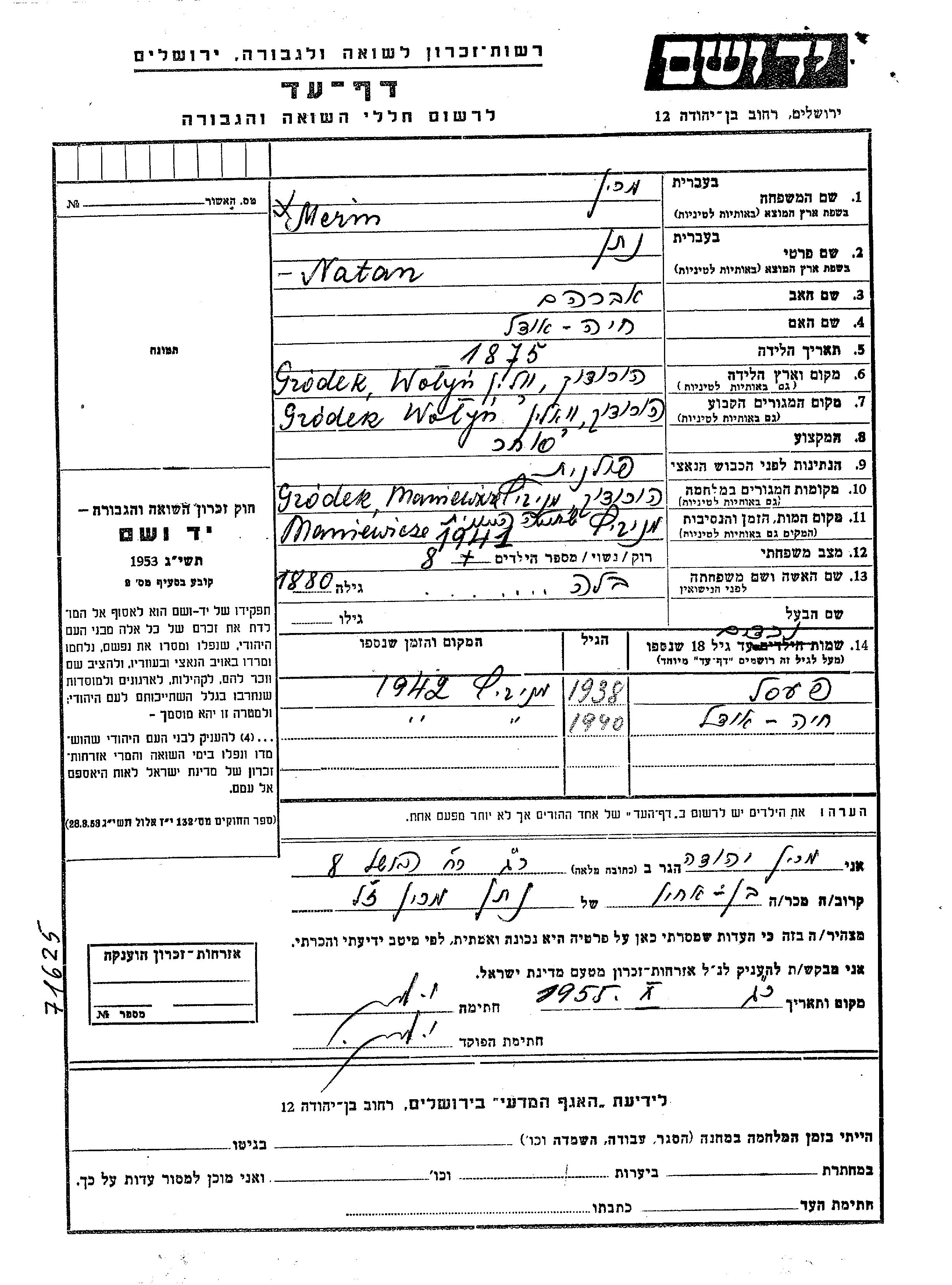 Merin Marin Khaia Udel Gródek, Poland Page of Testimony