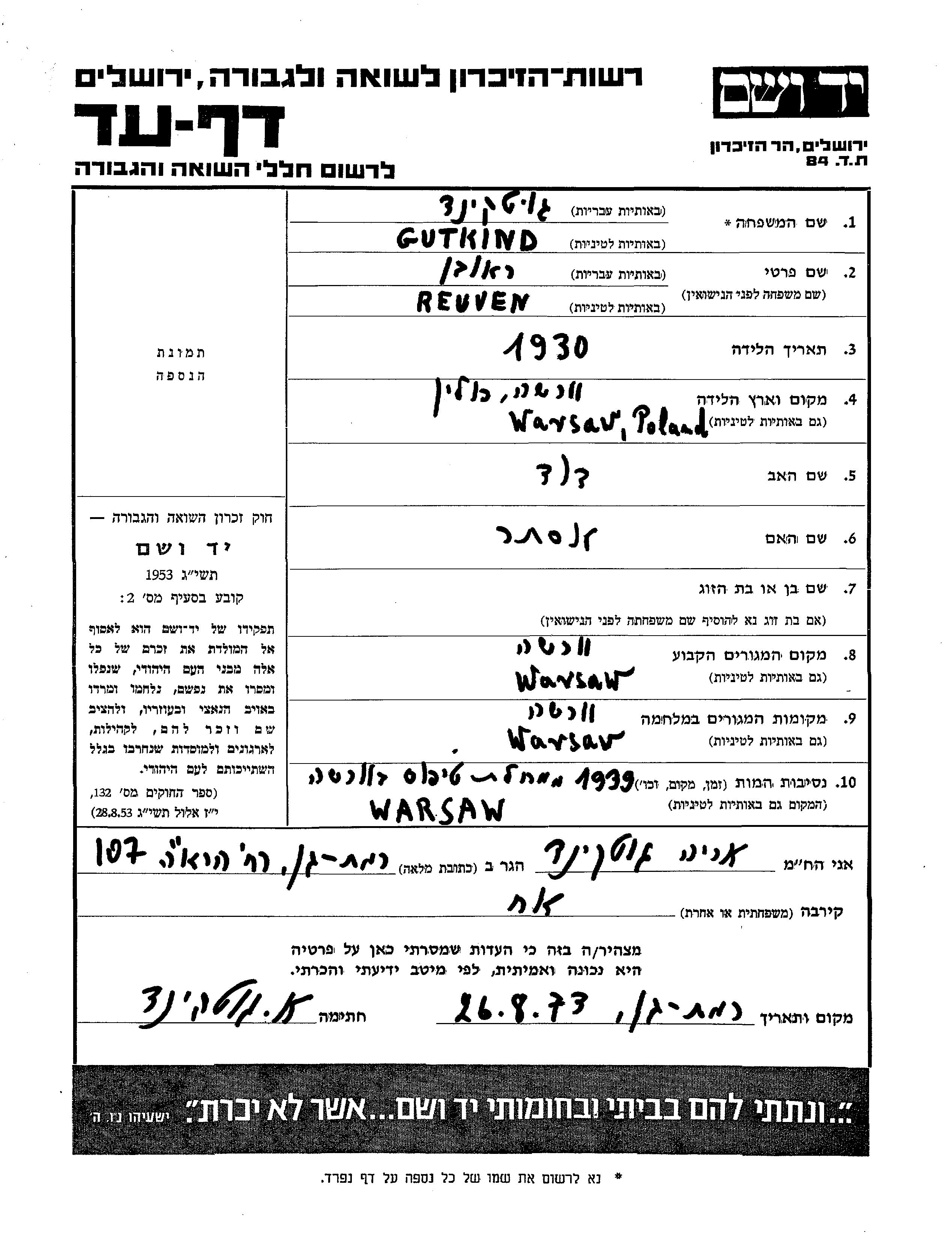 Gutkind Reuven 1930 Warsaw, Poland Page of Testimony