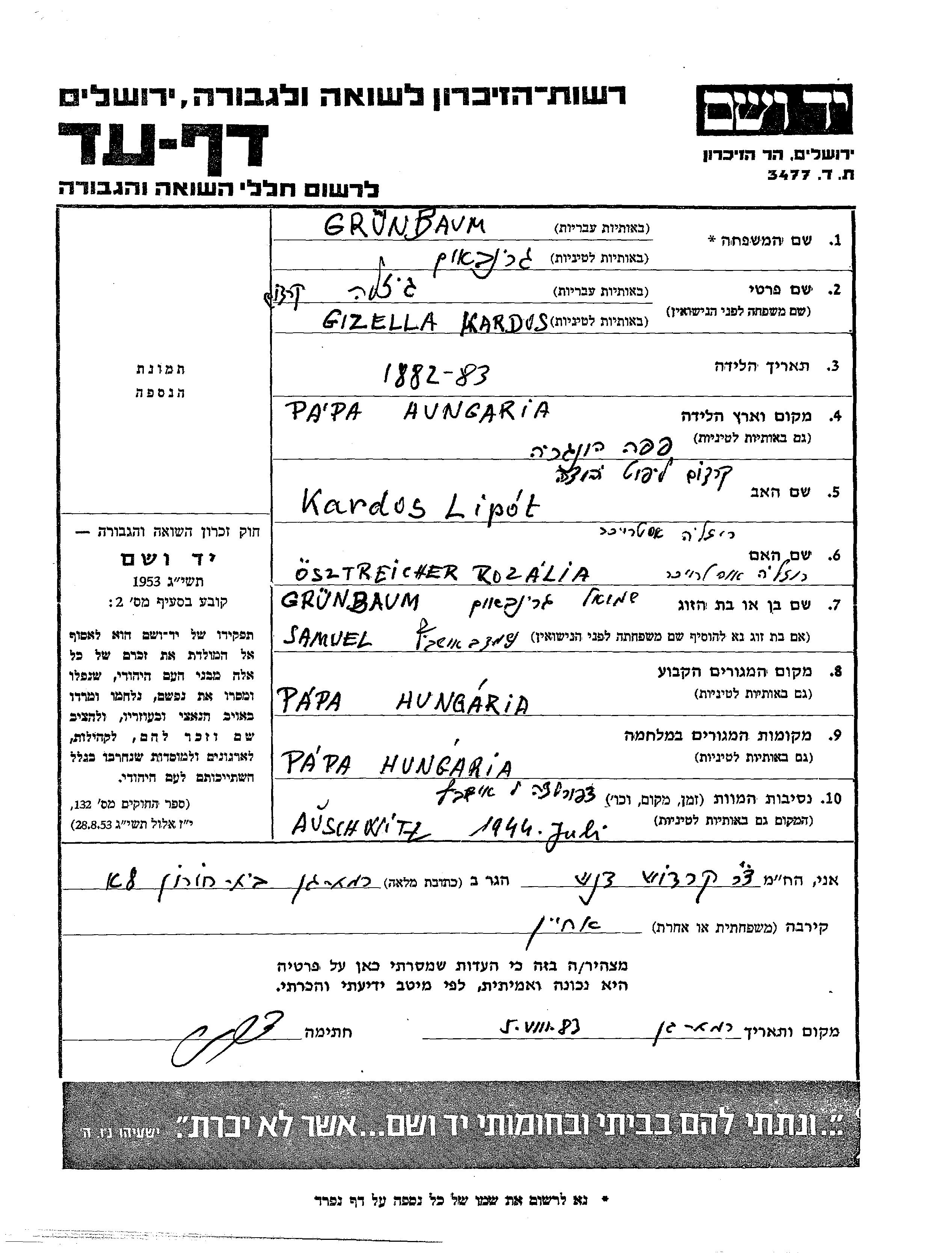 Grunbaum Grinbaum Gizella 1882 Papa, Hungary Page of Testimony