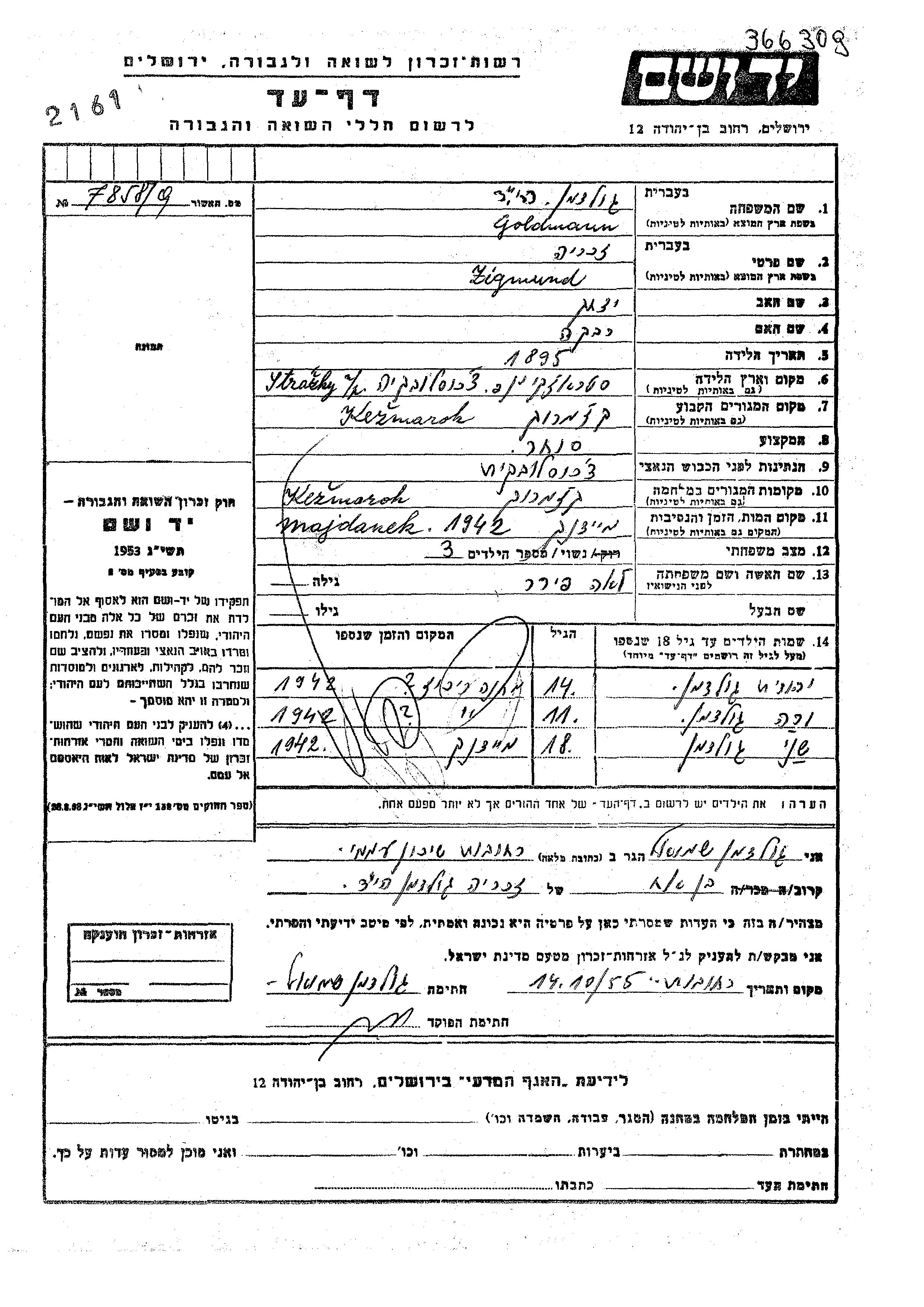 Goldmann Yehuda Kezmarok, Czechoslovakia Page of Testimony