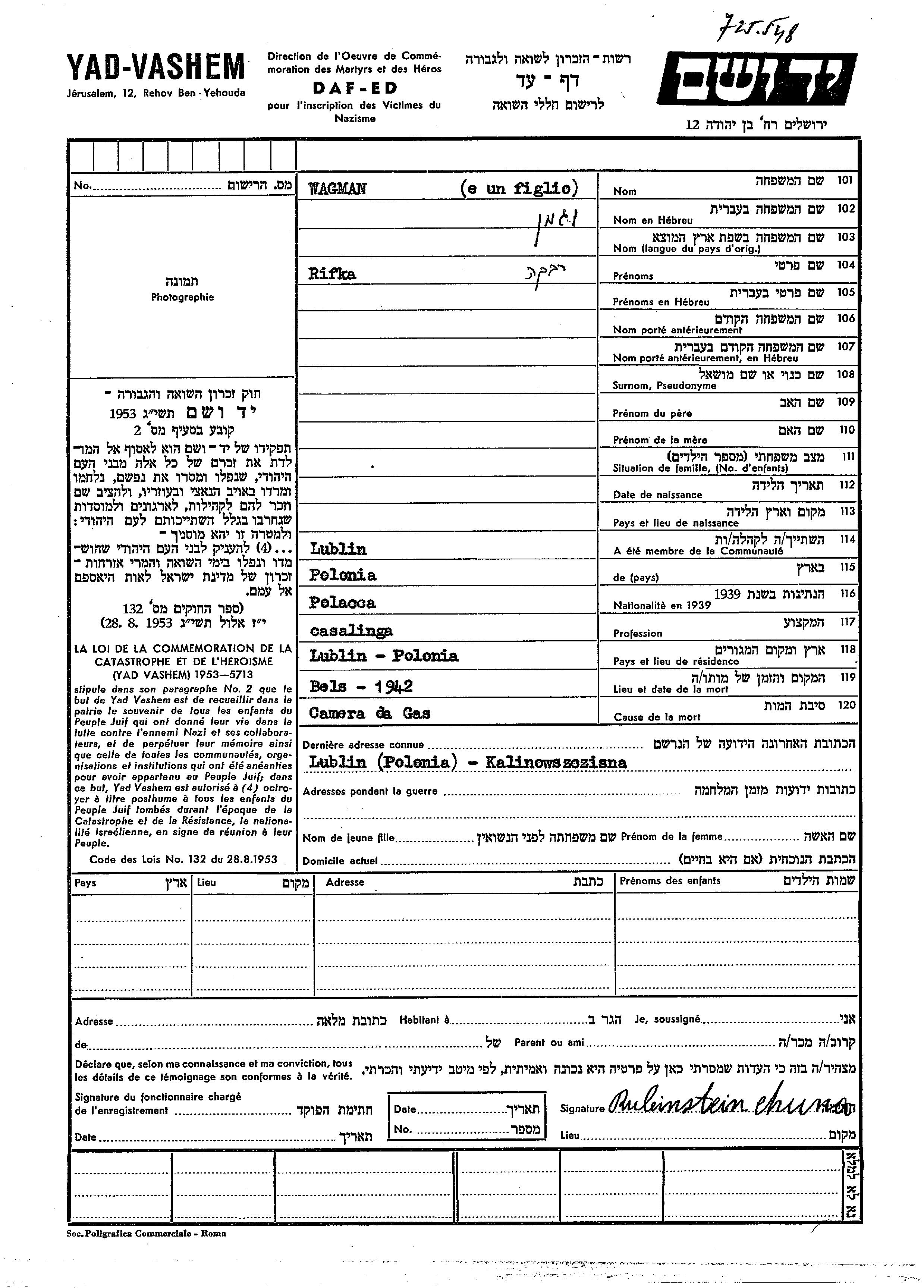 Wagman Rifka Lublin, Poland Page of Testimony
