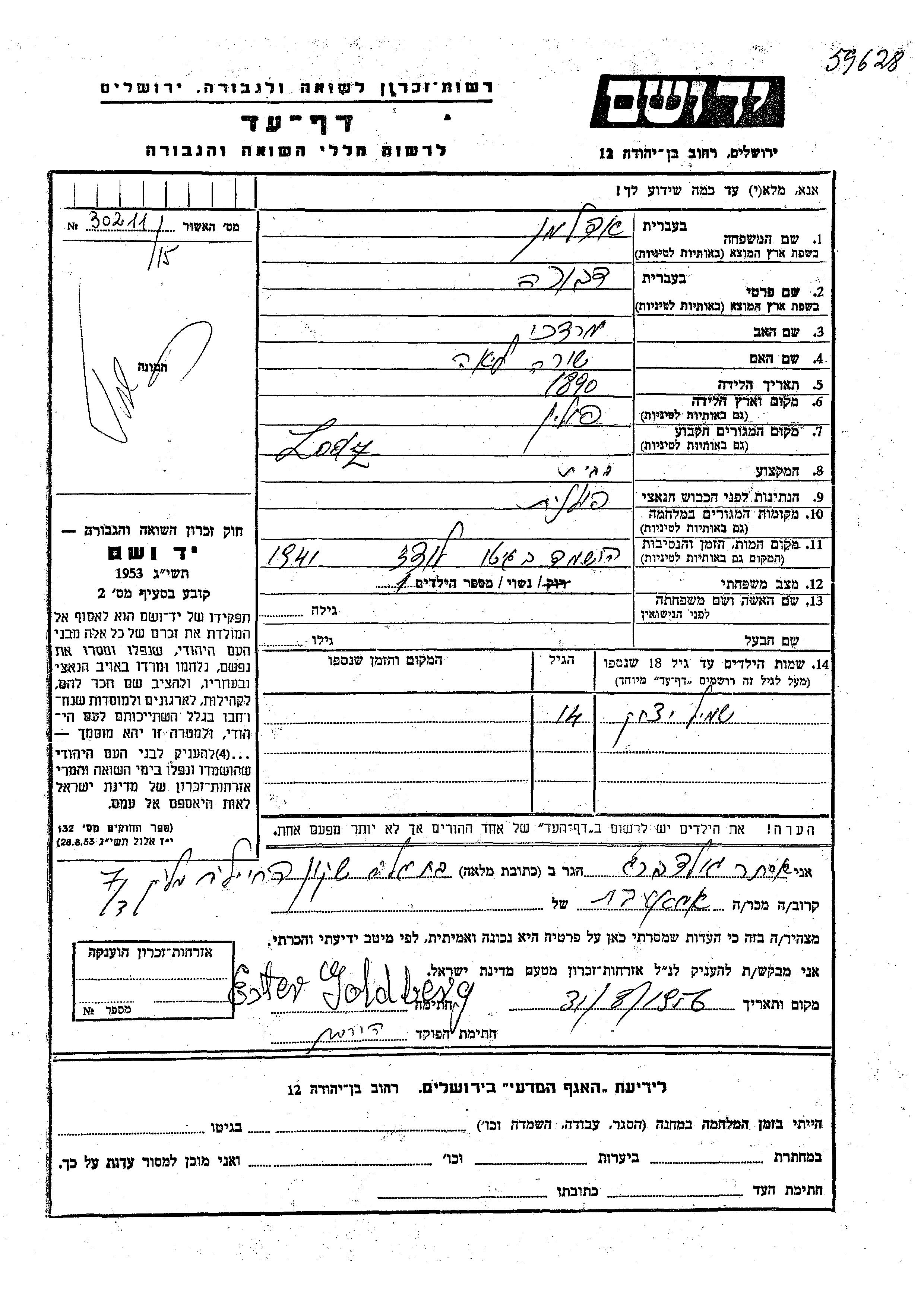 Yad Vashem - Pages of Testimony Names Memorial Collection