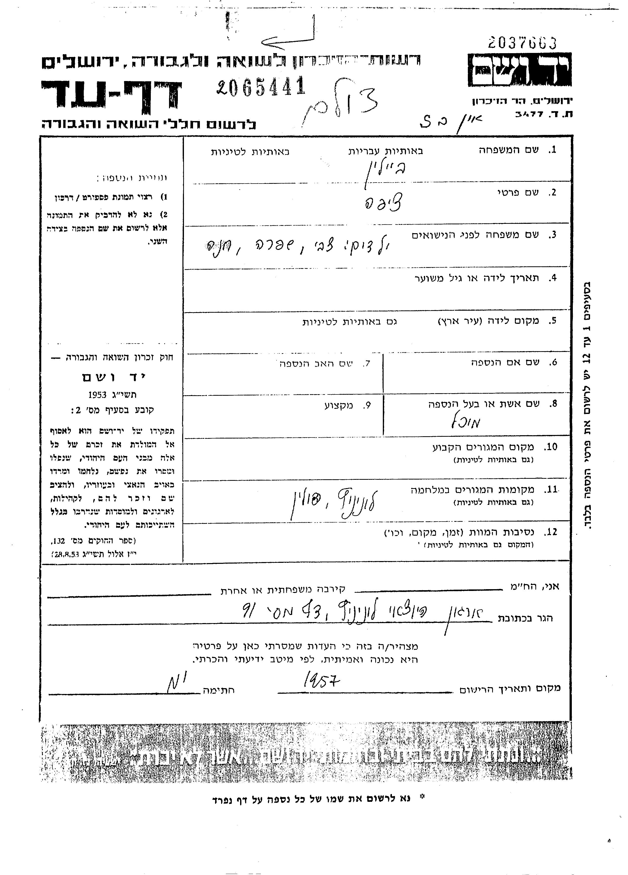 Beilin Tzvi unstated place, Page of Testimony