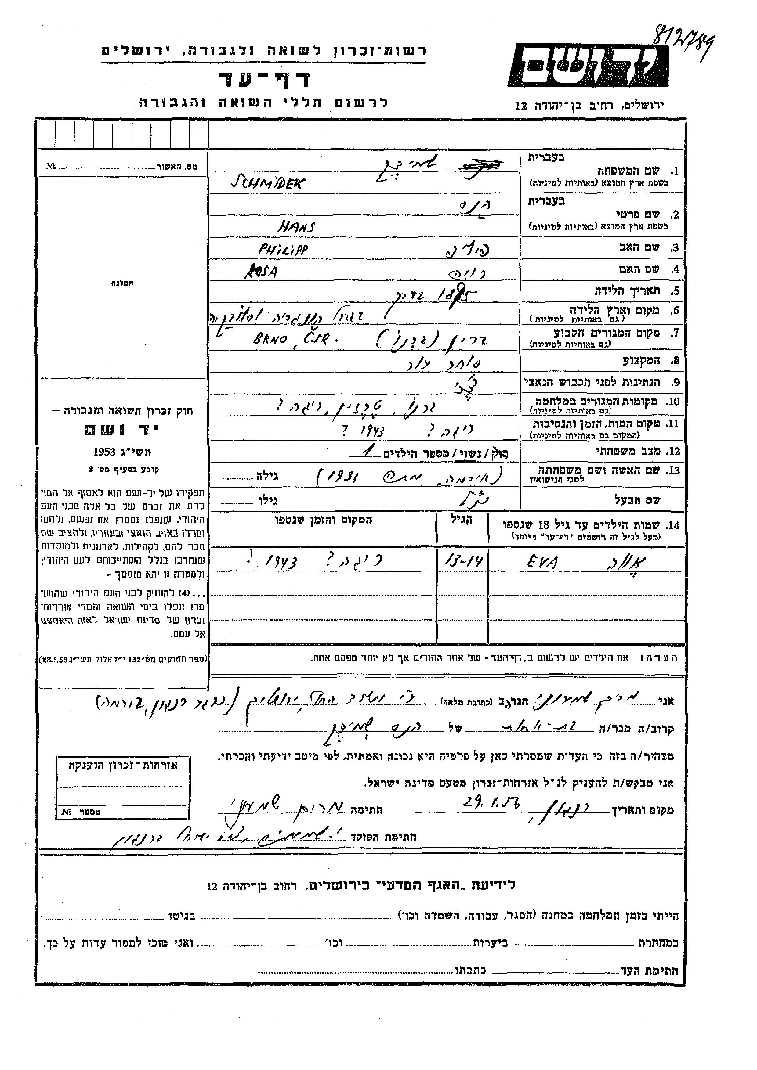 Eva Schmidek was born to Hans and Irma. She was child. Prior to WWII she lived in Brno, Czechoslovakia. During the war she was in Brno, Czechoslovakia. Eva was murdered in the Shoah.