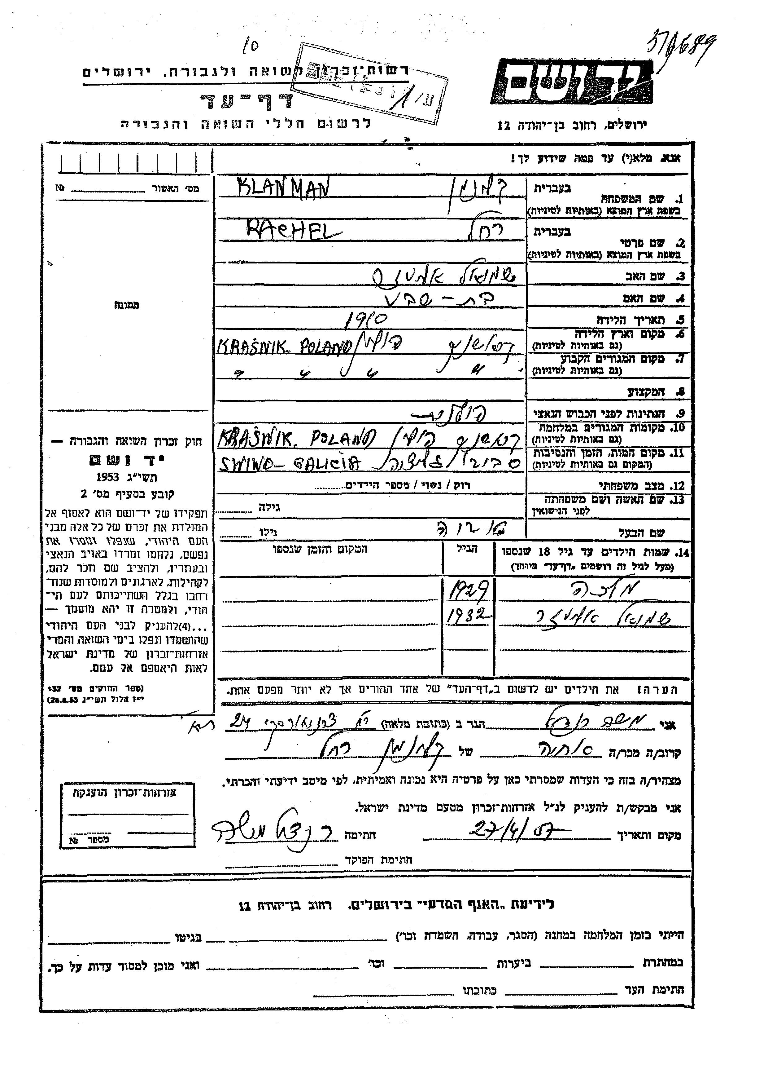 Malka Klanman was born, 1929 to Tuvia and Rachel. She was child. Prior to WWII she lived in Kraśnik, Poland. During the war she was in Kraśnik, Poland. Malka was murdered in the Shoah.