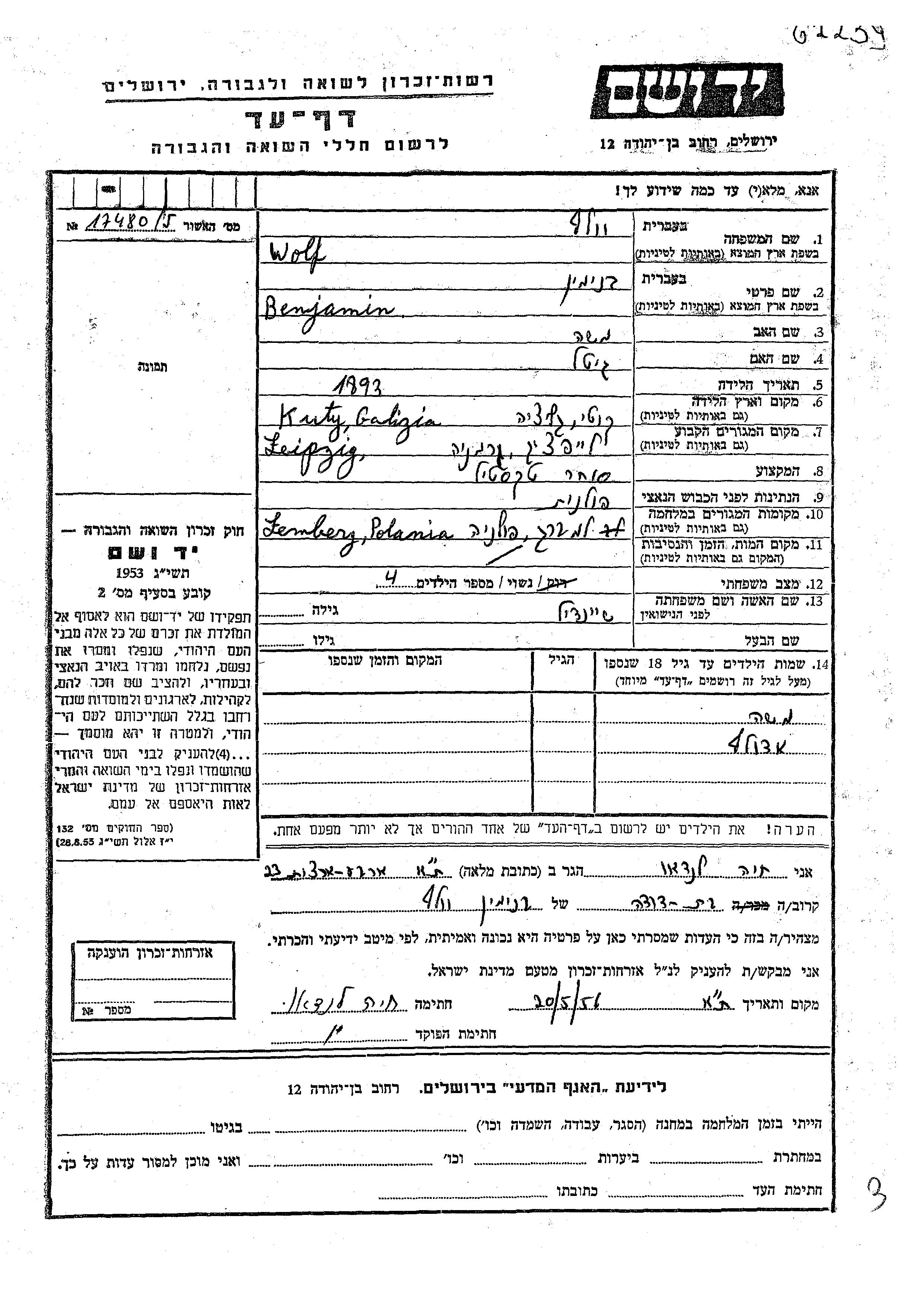 Adolf Wolf was born to Benjamin and Sheindil. He was child. Prior to WWII he lived in Leipzig, Germany. During the war he was in Lemberg, Poland.