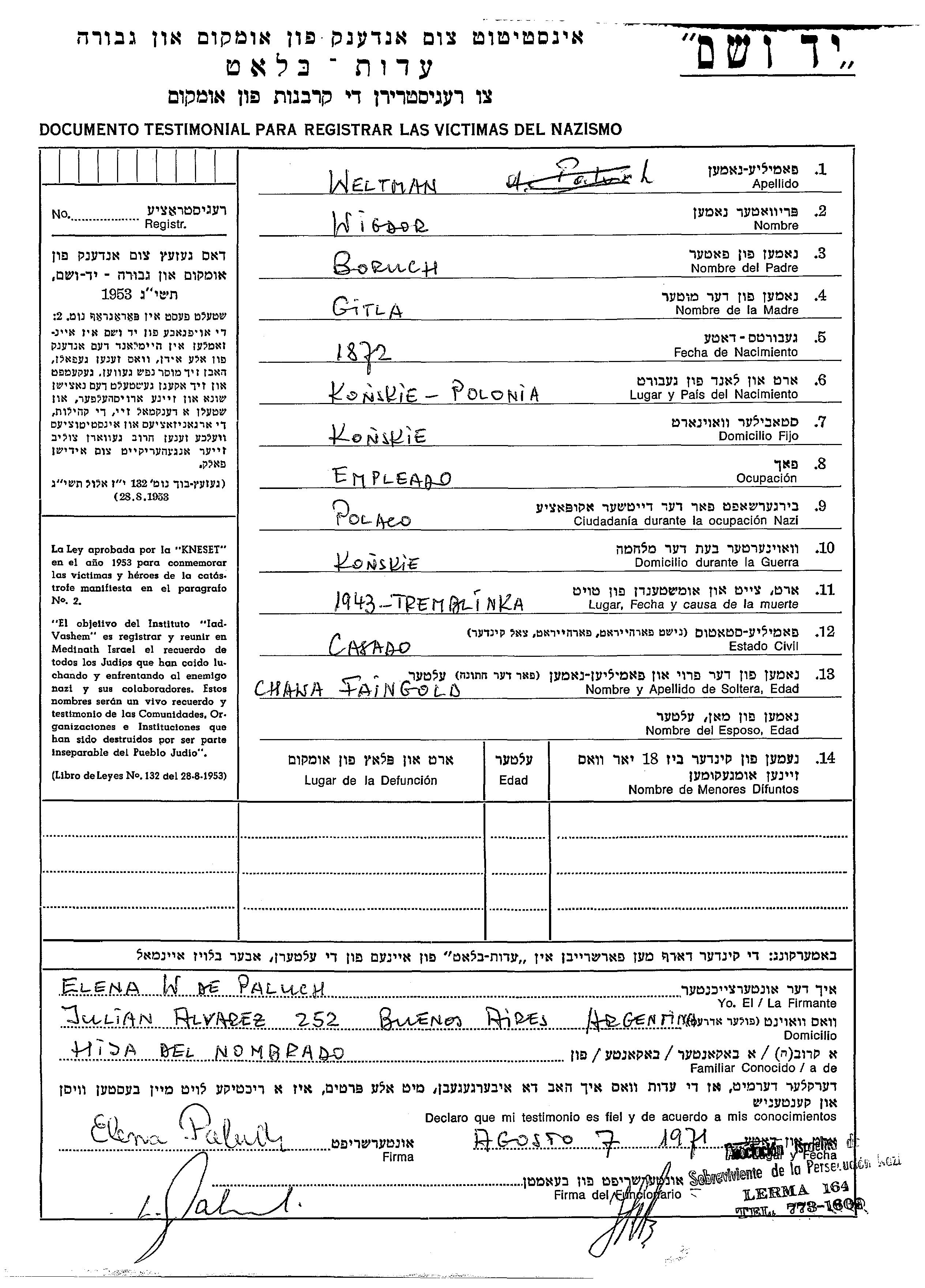 Weltman Wigdor 1882 Końskie, Poland Page of Testimony