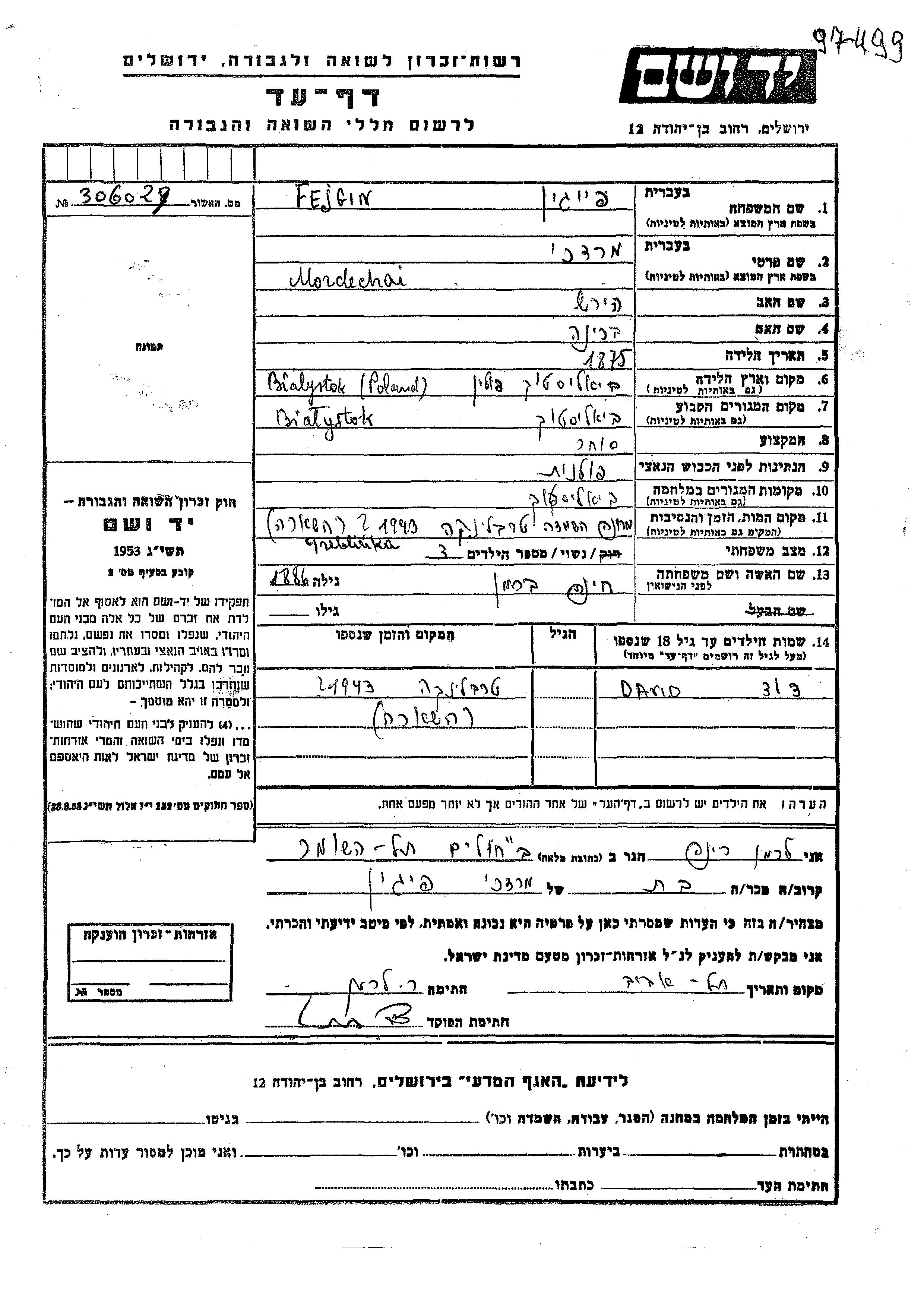 David Fejgin was born to Mordekhai and Chiena. He was child. Prior to WWII he lived in Bialystok, Poland. During the war he was in Bialystok, Poland.