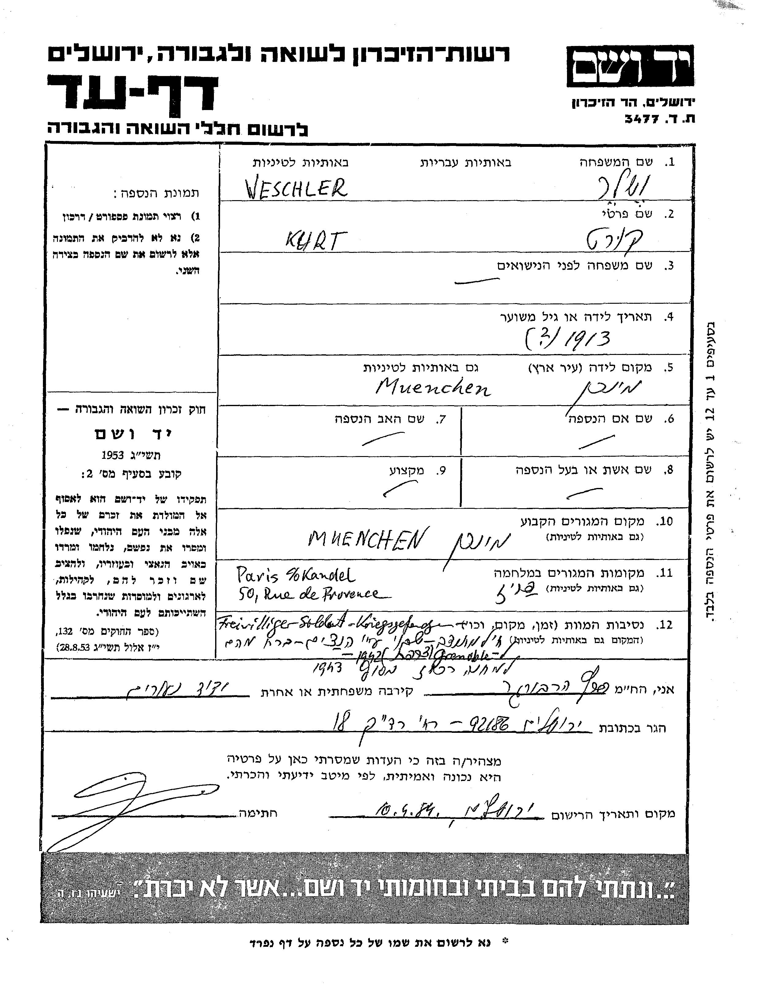 Weschler Kurt 1913 Muenchen, Germany Page of Testimony