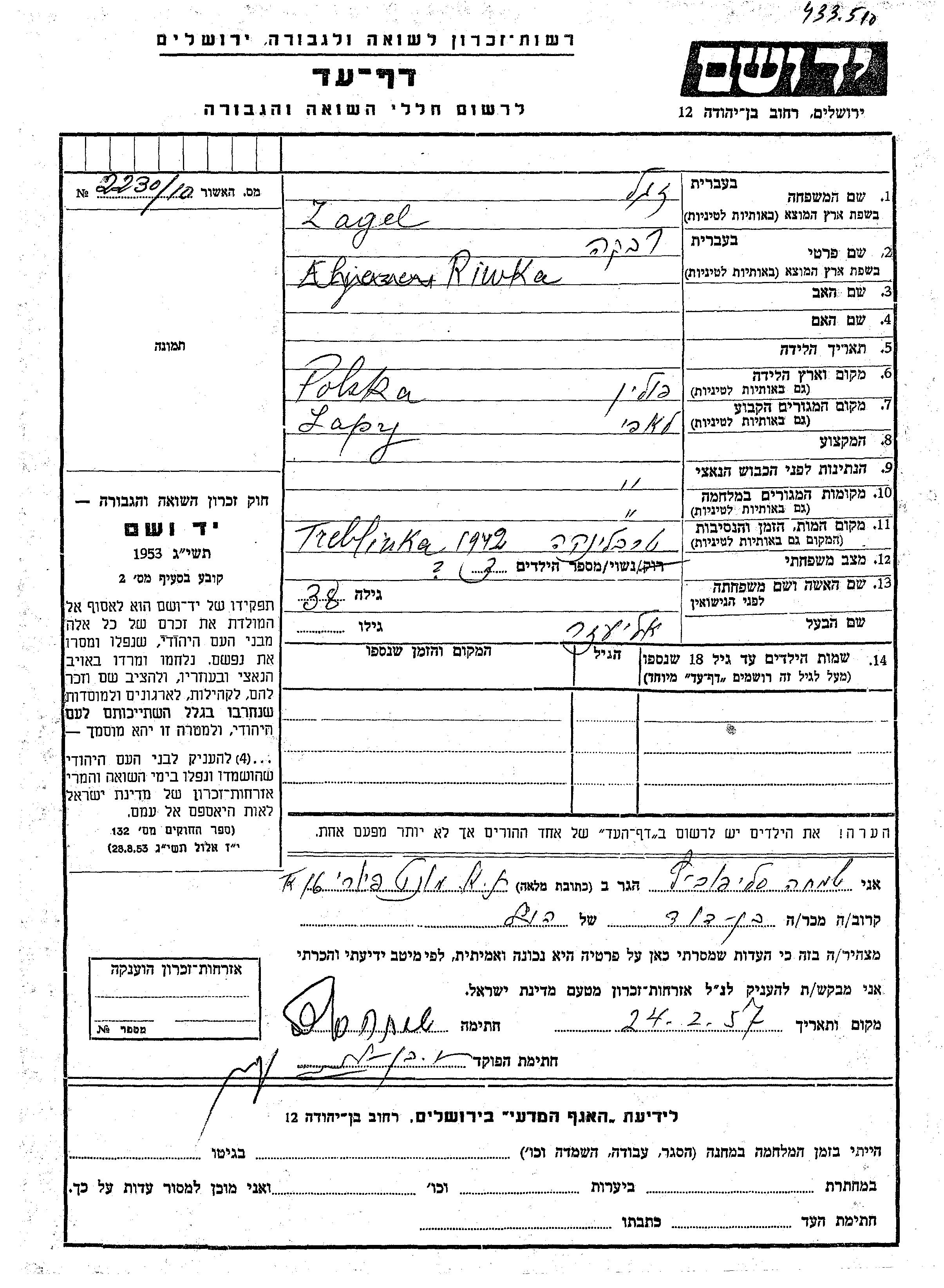 Riwka Zagel was born in Poland. She was married to Eliezer. Prior to WWII she lived in Łapy, Poland. During the war she was in Łapy, Poland. Riwka was murdered in the Shoah. Place of death: Treblinka, Poland, 1942.
