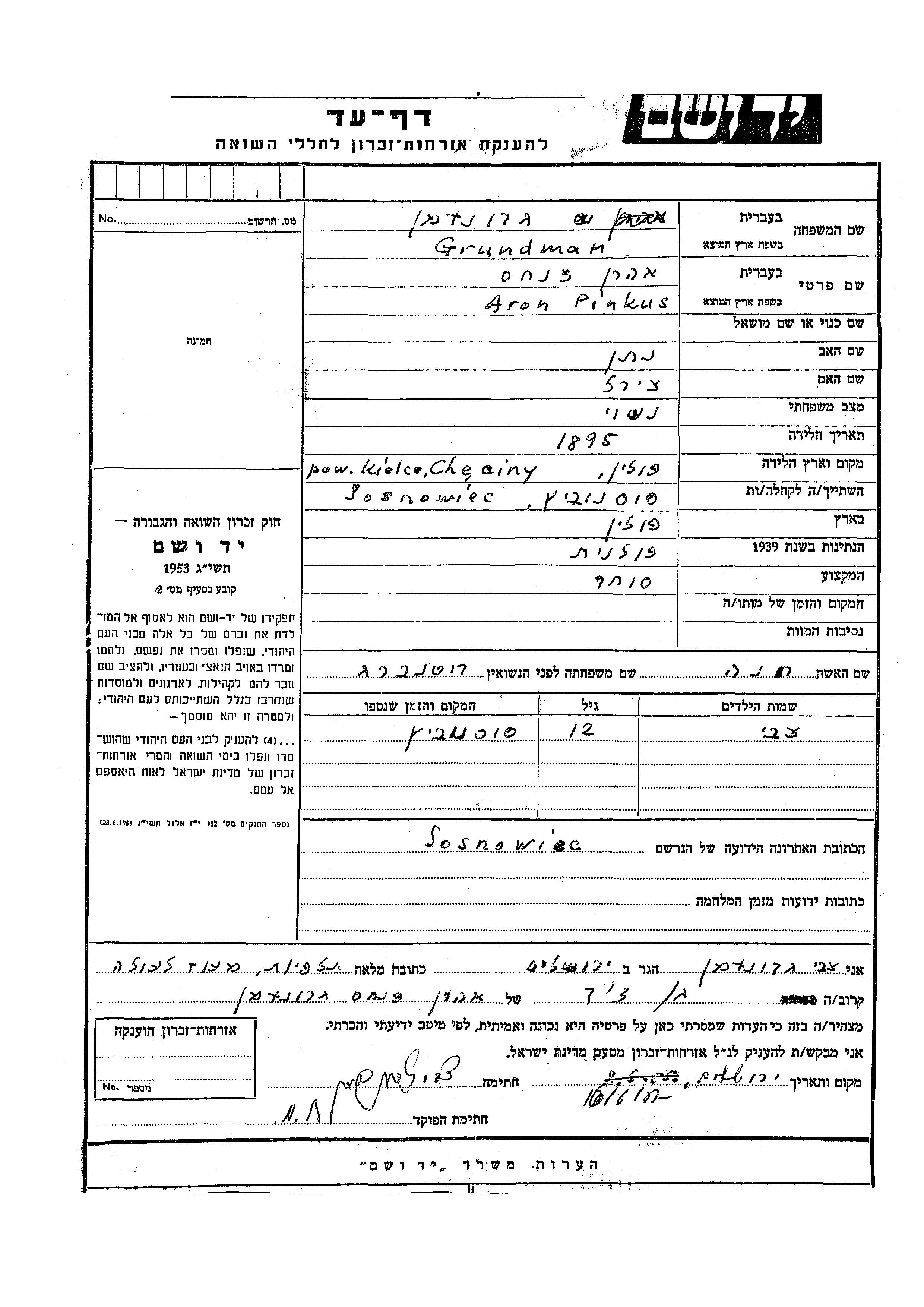 Grundman Tzvi Sosnowiec, Poland Page of Testimony