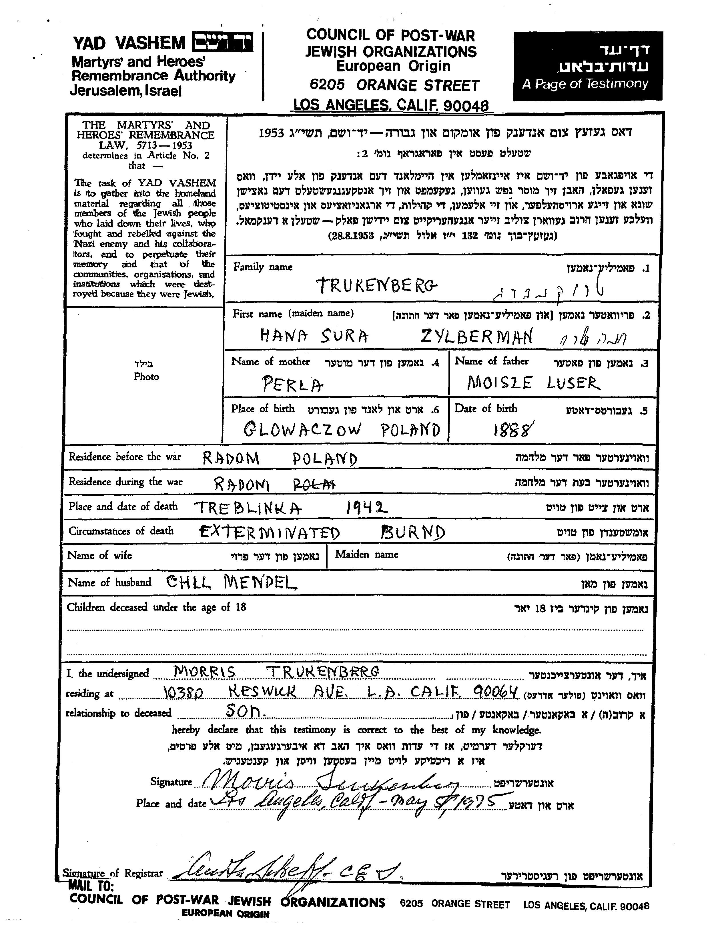 Hana Sura Trukenberg nee Zylberman was born in Glowaczow, Poland, 1888 to Moisze Luser and Perla. She was married to Chil Mendel. Prior to WWII she lived in Radom, Poland. During the war she was in Radom, Poland. Hana Sura was murdered in the Shoah. Place of death: Treblinka, Poland, 1942.