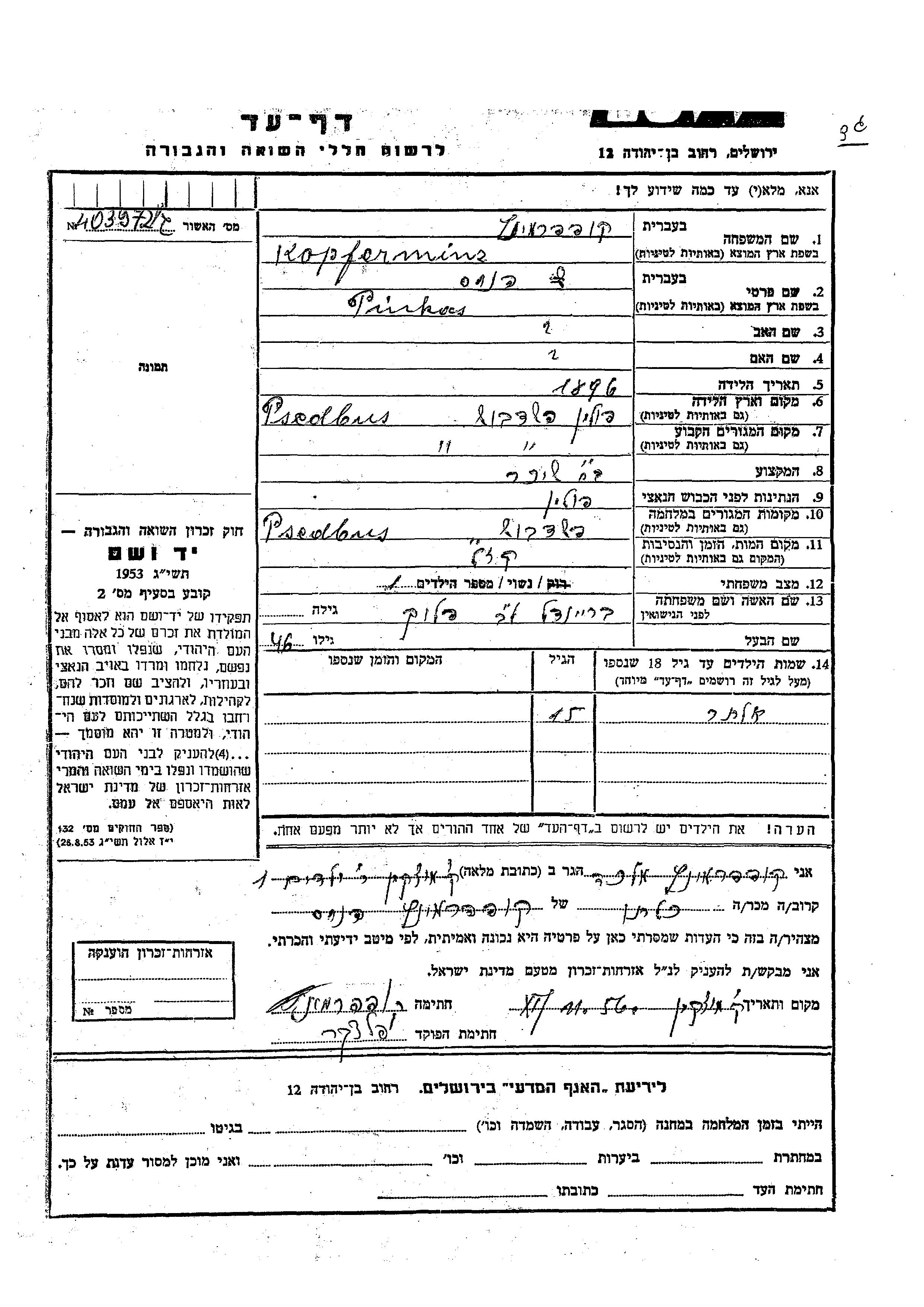 Alter Kopferminz was born to Pinchas and Braindel nee Palukh. He was child. Prior to WWII he lived in Przedburz, Poland. During the war he was in Przedburz, Poland.