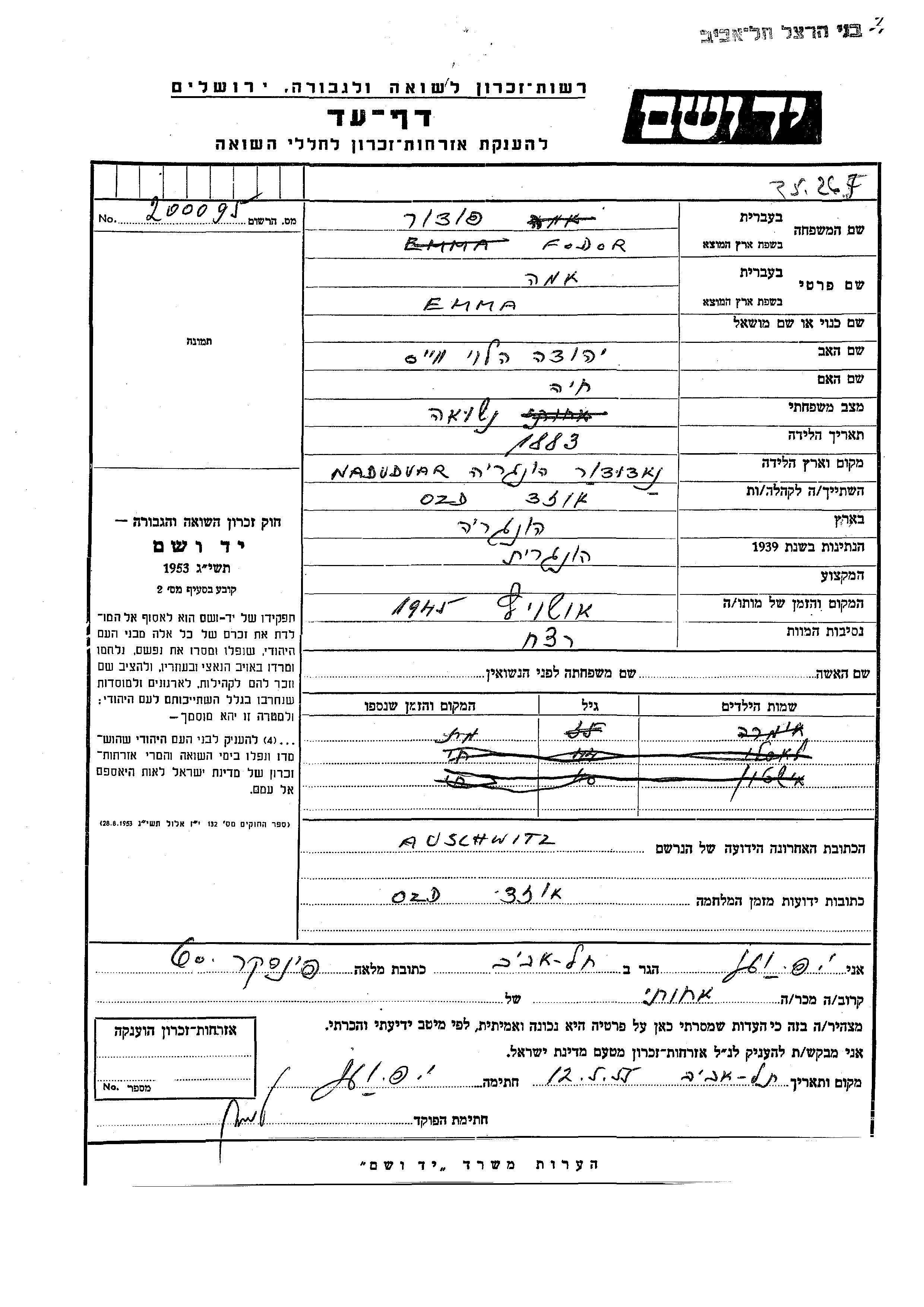 Emma Fodor nee Vais was born in Nadudvar, Hungary, 1883 to Yehuda Halevi and Khaia. She was married. Prior to WWII she lived in Ozd Ludus, Romania. During the war she was in Ozd. Emma was murdered in the Shoah. Place of death: Auschwitz, Poland, 1945.