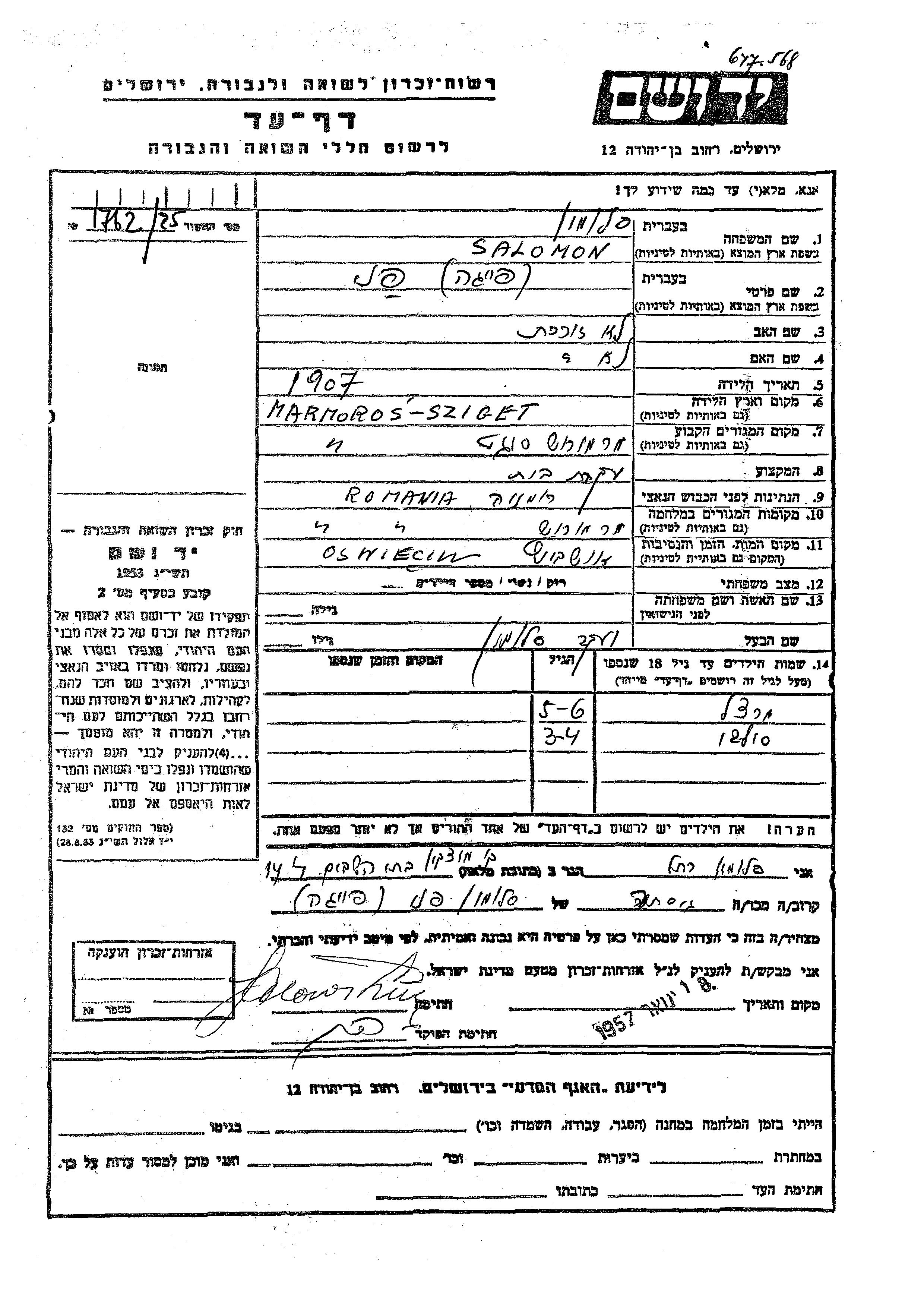 Salomon Martzel Marmorossziget, Romania Page of Testimony