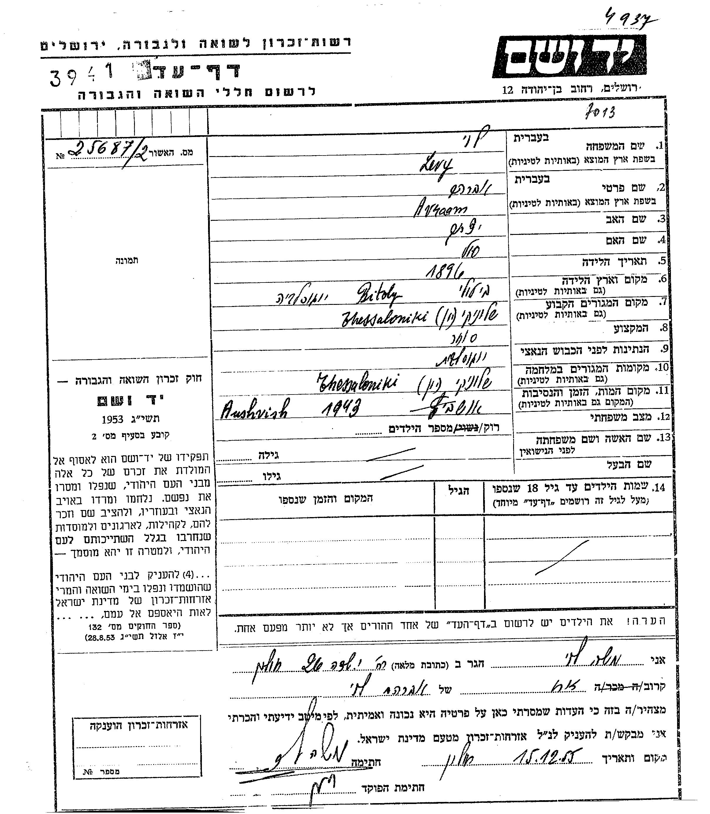 Avraam Levy was born in Bitolj, Yugoslavia, 1896 to Yitzkhak and Sol. He was a merchant and single. Prior to WWII he lived in Saloniki, Greece. During the war he was in Saloniki, Greece. Avraam was murdered in the Shoah. Place of death: Auschwitz, Poland, 1943.